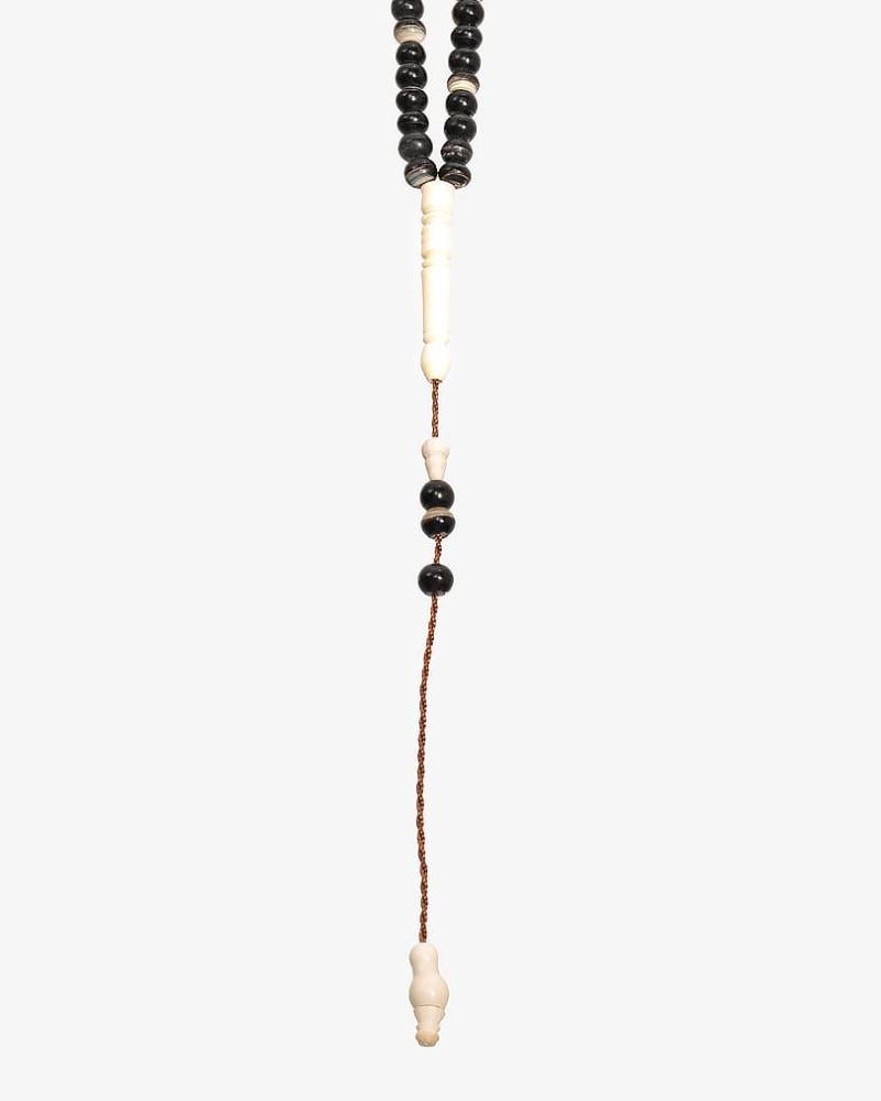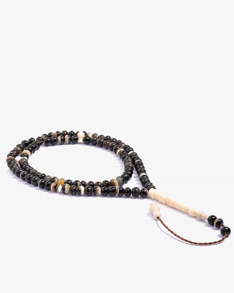 سبحة قرن جاموس الفاخرة مطعم بعظم الجمل، بكركوشة خيوطها ناعمة وتتميز بتفاصيلها الجميلة منحوتة بطريقة رائعة واتقان ذروي الشكل ناعمة الملمس، صممت لإظهار اناقة مالكها وقوة حضوره واناقته وذوقه الرفيع، يمتاز الخيط بانه متين ومتماسك بها 99 خرزة 6 ملم وزنها 18 غرام, لتناسب جميع الاذواق.