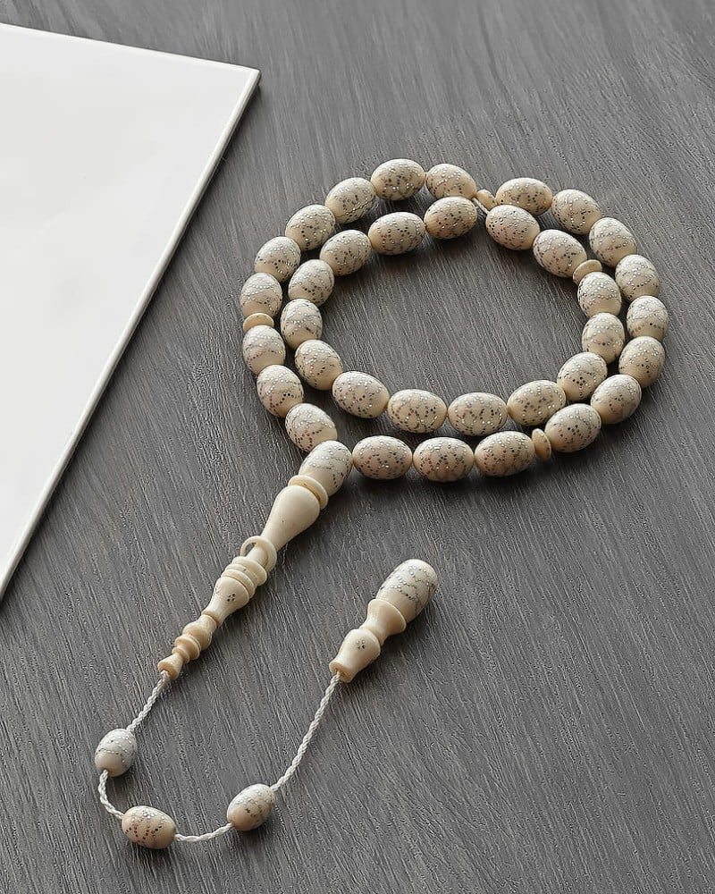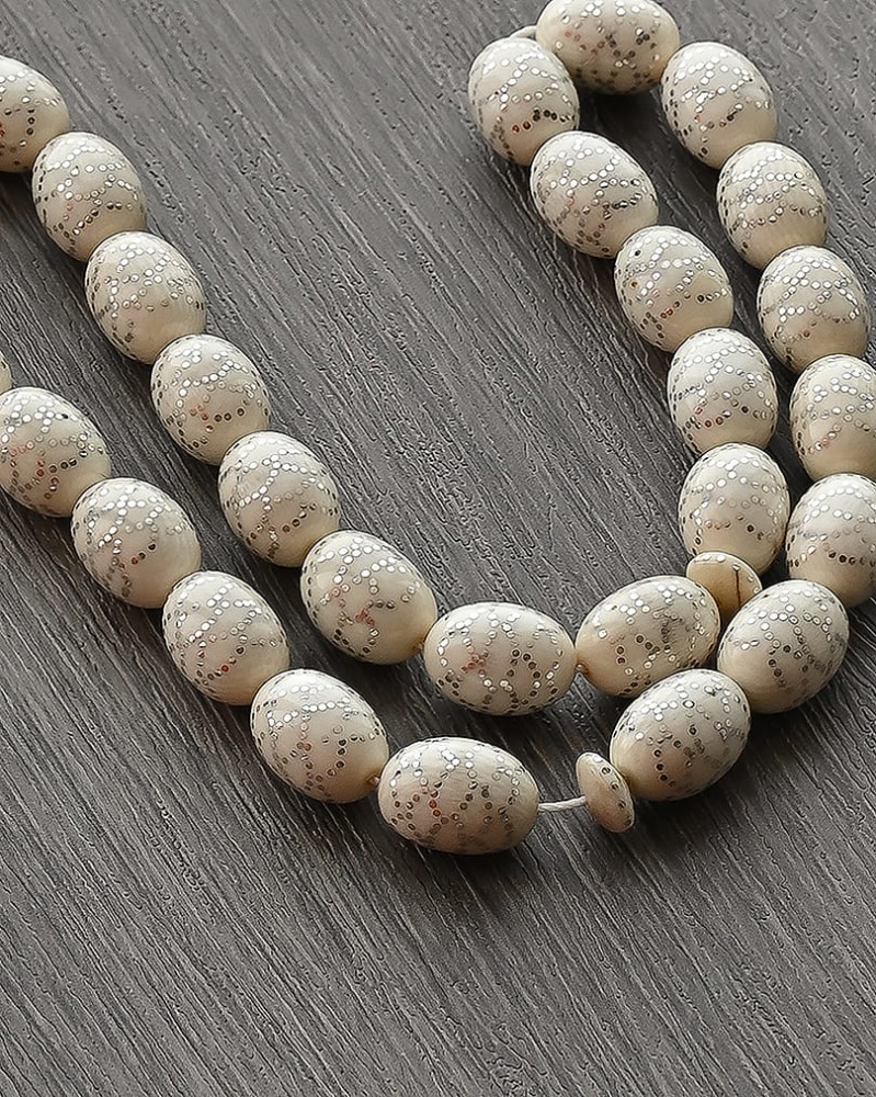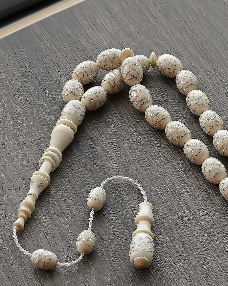 سبحة فخمة ونادرة من عاج ناب الفيل، مزينة بفضة خالصة تضفي عليها لمسة من الأناقة والفخامة. تصميم مخروطي بشكل بيضاوي متجانس يعطيها مظهراً راقياً وأنيقاً، مع تفاصيل دقيقة وناعمة تجعلها قطعة فنية فريدة من نوعها. صُممت هذه السبحة اليدوية بعناية وحرفية عالية، لتظهر جمال ورقي مالكها بشكل لا يضاهى. احصل على هذه السبحة الرائعة واجعلها جزءاً من إطلالتك اليومية، لتبقى مصدر فخر وإعجاب لفترة طويلة قادمة.