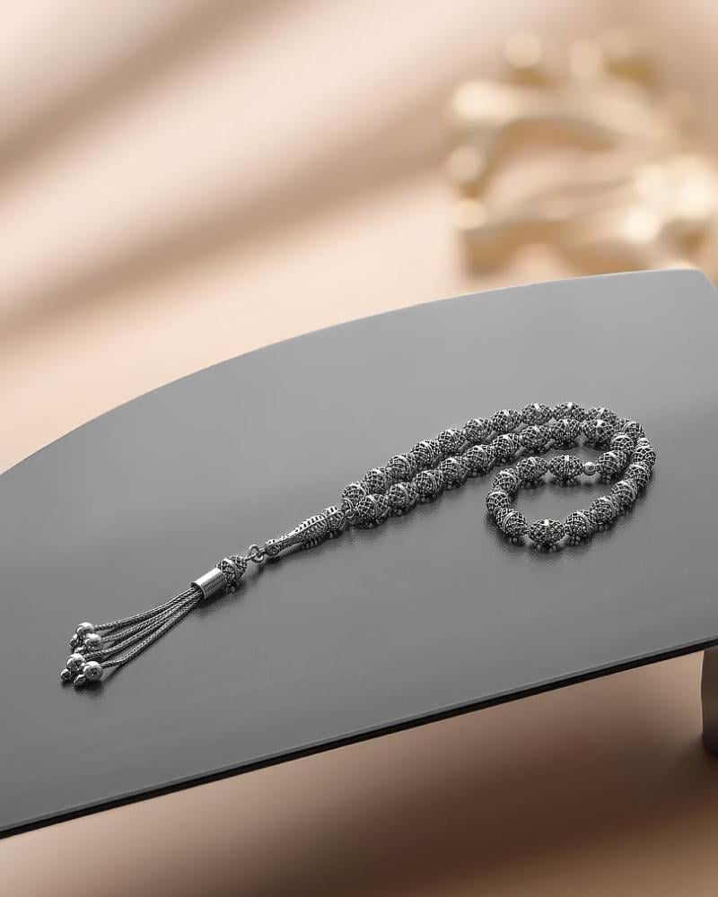 سبحة نادرة من الفضة الخالصة عيار 925 الانيقة، مزينة بكركوشة منقوشة باتقان ومصممة بشكل بيضاوي منقوش متجانس ناعم الملمس. تمتاز هذه السبحة بأناقتها وفخامتها، صنعت بعناية يدوية لتبرز جمال مالكها. تتميز بجودتها العالية وتصميمها الراقي، مما يجعلها مثالية لتكون إكسسوارًا راقيًا وفخمًا يناسب جميع الأذواق.
