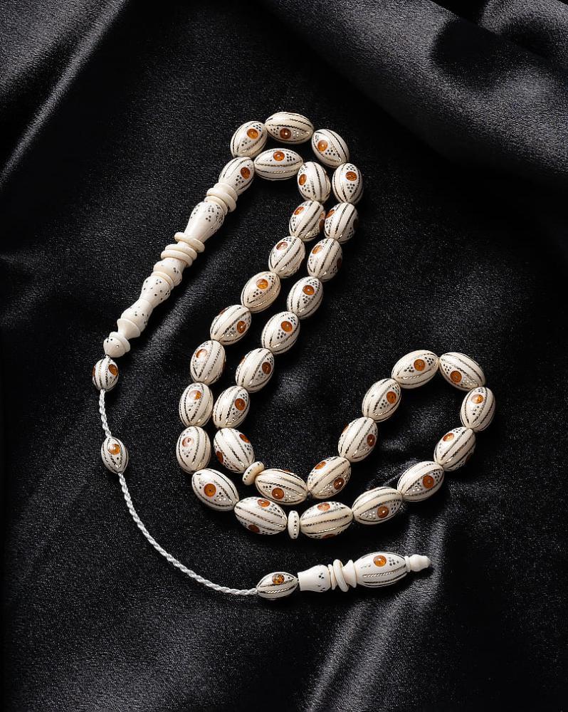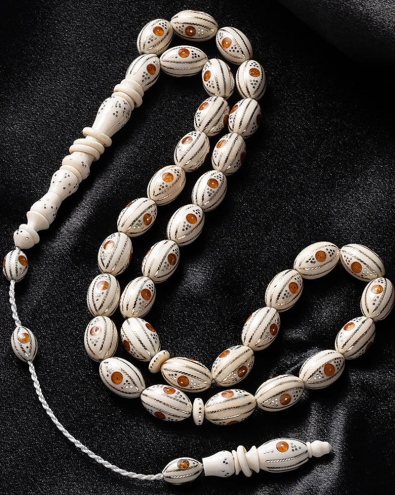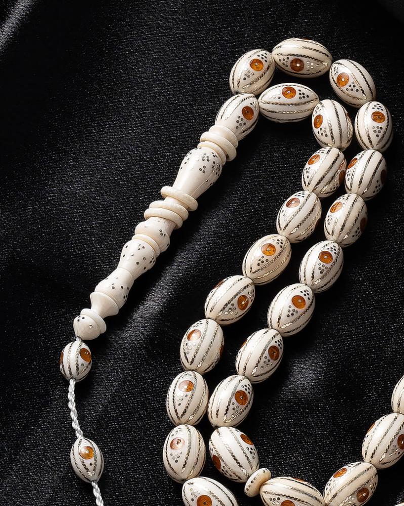 سبحة فاخرة ونادرة من العاج (ناب الفيل) المنقوش بفضة وشبيه الكهرمان، تتميز بشكل بيضاوي متجانس يجعلها تبدو بلا مثيل. تم صنع هذه السبحة يدوياً لتبرز أناقة وفخامة مالكها، وتضفي لمسة من الأناقة والجمال على إطلالته. العاج الذي تم استخدامه في صناعتها يحتفظ بجودته وجماله لفترة طويلة، مما يجعلها قطعة فريدة وأنيقة تضفي لمسة من الفخامة على أي مظهر. تصميم رائع يناسب جميع الأذواق ويضفي لمسة من الجمال والتميز على مظهرك. لا شك أن هذه السبحة ستكون إضافة رائعة ومميزة لمجموعتك الخاصة.