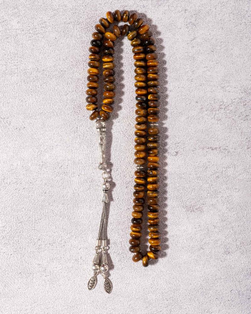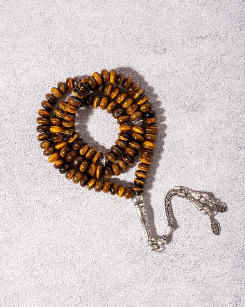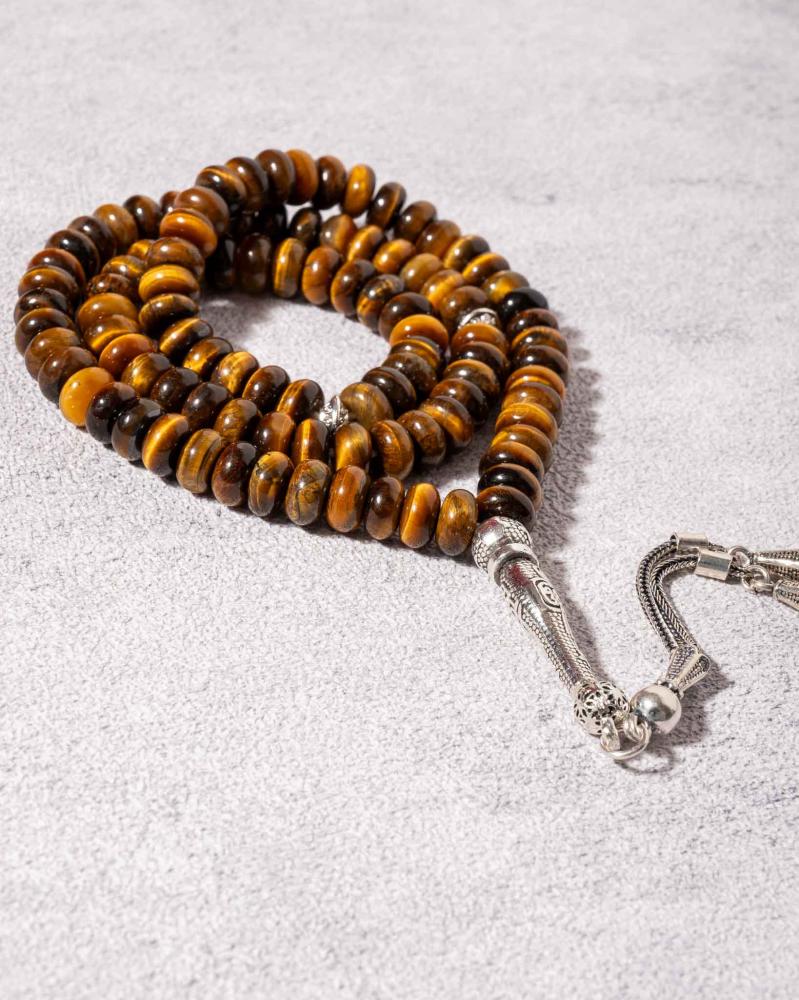 سبحة حجر عين النمر انيق، تتميز بلمسة نهائية مصقولة بإتقان، تضفي عليها مظهراً ناعماً وأنيقاً. تأتي بألوان جذابة تجعلها قطعة فريدة من نوعها، مصممة لتبرز أناقة وقوة مالكها، وتعكس ذوقه الرفيع بشكل مثالي.