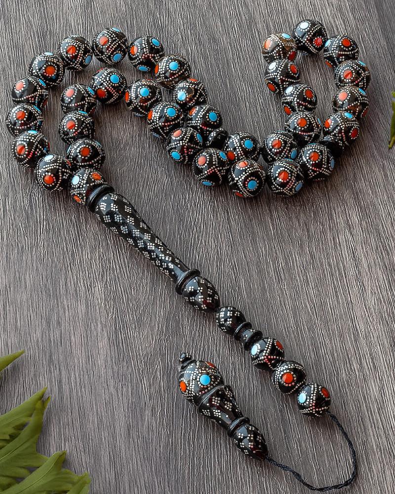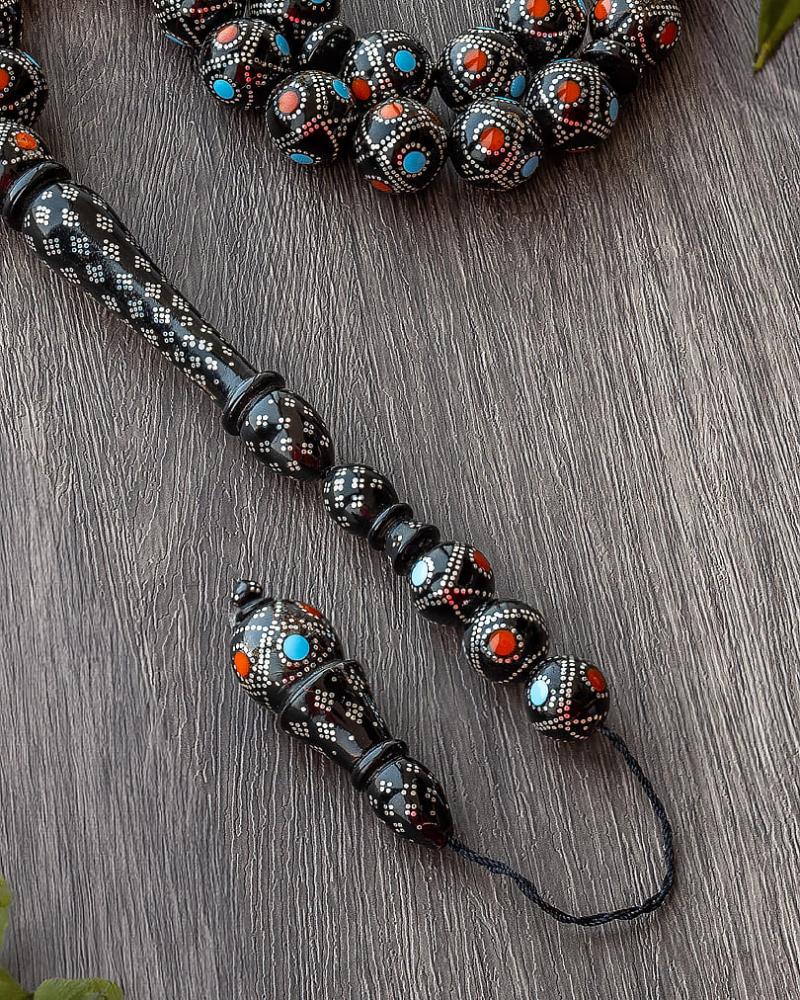 سبحة فاخرة ونادرة من خشب يسر طبيعي بفضة خالصة، مزينة بشبيه الفيروز والكهرمان طبيعي لتضفي لمسة من الجمال والفخامة. ومزودة بشرابة مطعمة بالفضة. تمتاز بتقطيعها البيضاوي المتجانس والناعم مع لونها المبهر وملمسها الجذاب يجعلانها قطعة فنية فريدة ومميزة تضيف لمسة من الأناقة والجمال لأي شخص يحملها.