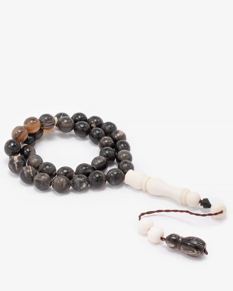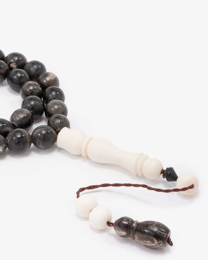 سبحة قرن جاموس انيقة ، تتميز بتفاصيلها الجميلة منحوتة بطريقة رائعة واتقان دائرية الشكل ناعمة الملمس صناعة يدوية، صممت لإظهار اناقة مالكها وقوة حضوره واناقته وذوقه الرفيع، يمتاز الخيط بانه متين ومتماسك بها 33 خرزة 10 ملم وزنها 28 جرام, لتناسب جميع الاعمار والاذواق.