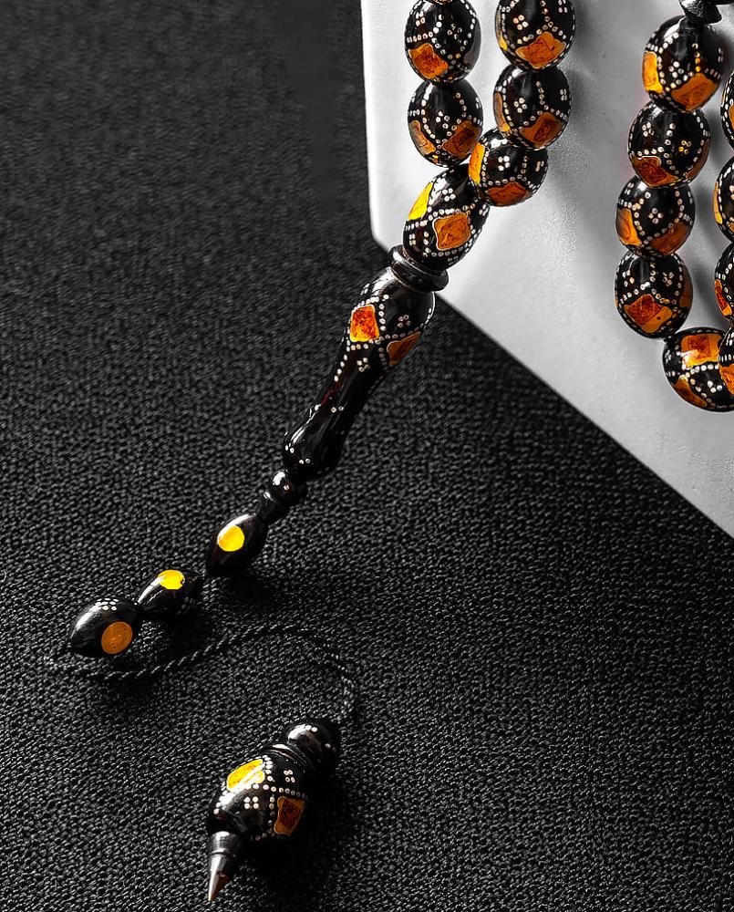 سبحة من خشب الكوك الطبيعي مزخرفة بالفضة الخالصة مزينة حجر شبية الكهرمان , بتقطيع بيضاوي متجانس ناعمة الملمس، صممت لإظهار اناقة مالكها، تتميز بحقيقة احتفاظها برائحة العطر مدة طويلة. من السبح الأكثر شهرة المميزة بخشبها الذي يستمر لوقت طويل حاملا نفس جودتها بها 33 خرزه 9 ملم وزنها 36 جرام ، جميلة وانيقة ورسمية في لونها ومظهرها لإطالة مميزة لتناسب جميع الاذواق