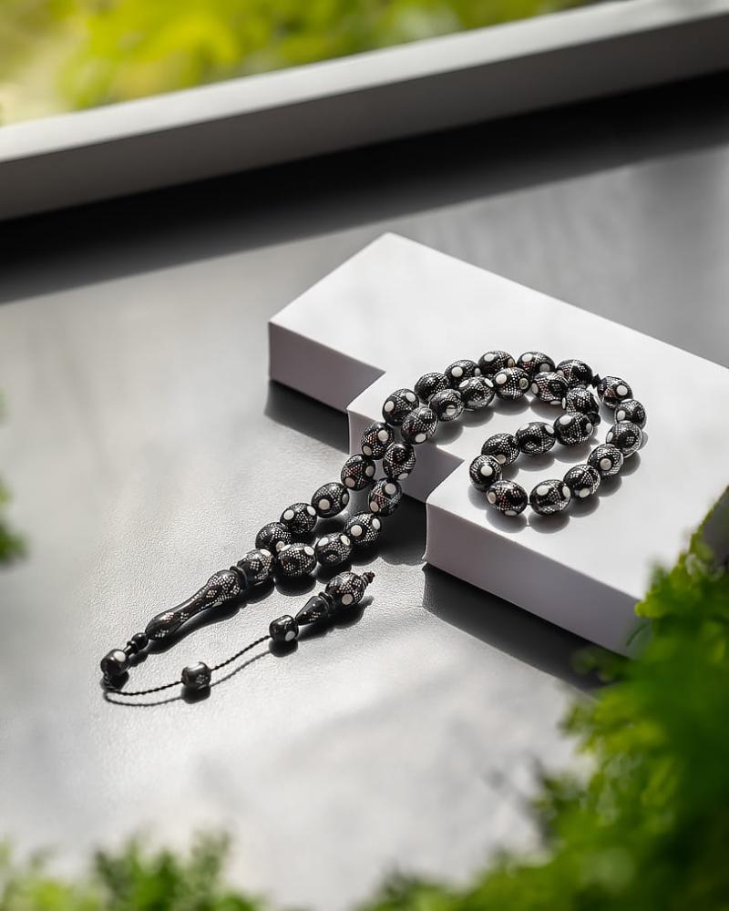 سبحة فخمة ونادرة من خشب الكوك الطبيعي، مزينة بالفضة وعاج ناب الفيل، تعتبر واحدة من أكثر السبح شهرة وتميزًا. تتميز بجمالها وأناقتها الفريدة، وتتميز بلونها المذهل ومظهرها الرائع. تتميز بتقطيعها البيضاوي المتجانس وملمسها الناعم، وتزين بشرابة مطعمة بالفضة. تأتي بتصميم مميز يناسب جميع الأذواق، وتضيف لمسة من الأناقة والفخامة إلى إطلالتك.
