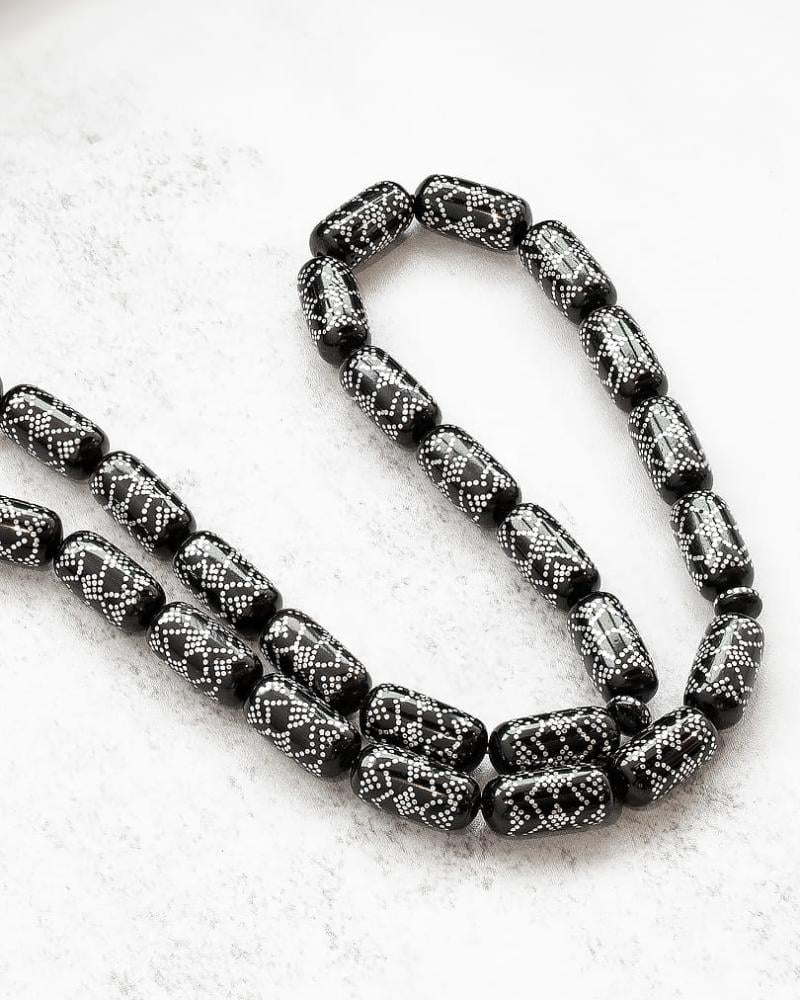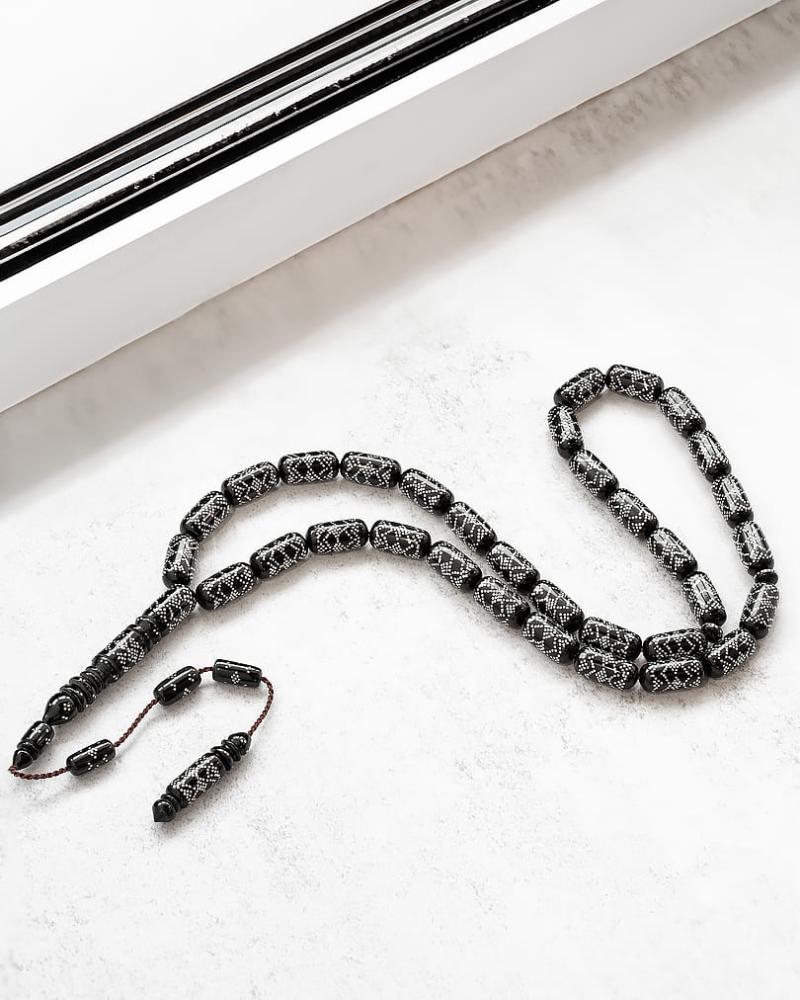 سبحة فريدة من نوعها، مصنوعة من الكوك الأسود والفضة المقلمة بدقة واهتمام فائقين. تتميز بتصميمها الأنيق والراقي، وتضفي لمسة من الفخامة والأناقة على من يحملها. تمتاز بجودتها العالية وتفاصيلها الدقيقة، مما يجعلها قطعة فنية فريدة تلفت الأنظار وتضفي لمسة من الجمال والأناقة على مظهرك. إنها تحفة فنية تجمع بين الأصالة والحداثة، وستكون إضافة رائعة إلى مجموعة الإكسسوارات الخاصة بك.
