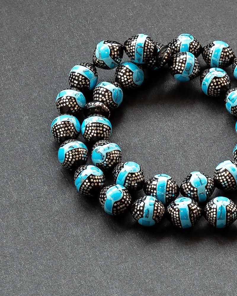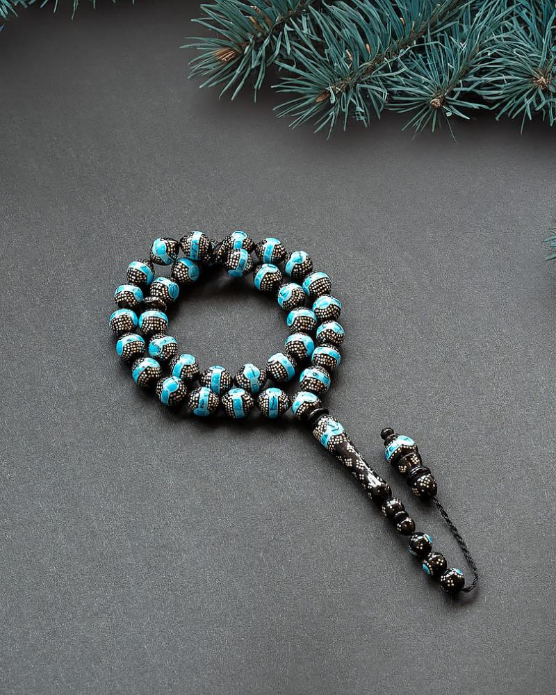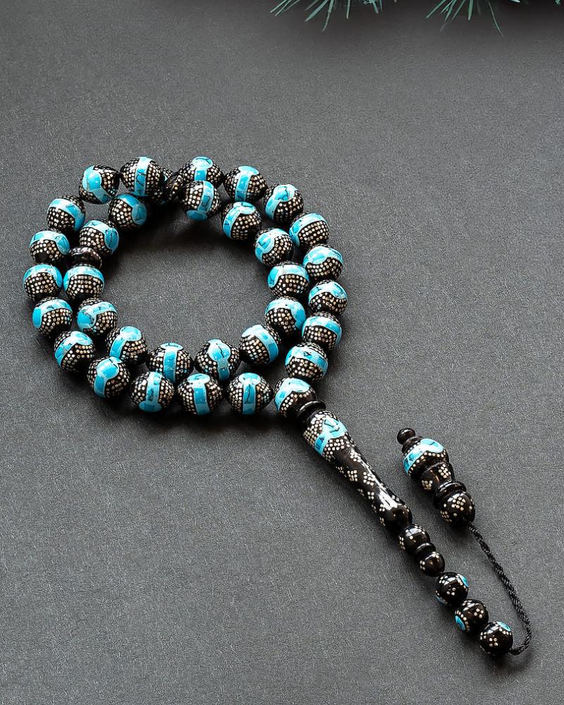 سبحة من خشب الكوك الطبيعي مزخرفة بالفضة الخالصة مزينة حجر شبية الفيروز , بتقطيع بيضاوي متجانس ناعمة الملمس، صممت لإظهار اناقة مالكها، تتميز بحقيقة احتفاظها برائحة العطر مدة طويلة. من السبح الأكثر شهرة المميزة بخشبها الذي يستمر لوقت طويل حاملا نفس جودتها بها 33 خرزه 9 ملم وزنها 26 جرام، جميلة وانيقة ورسمية في لونها ومظهرها لإطالة مميزة لتناسب جميع الاذواق.
