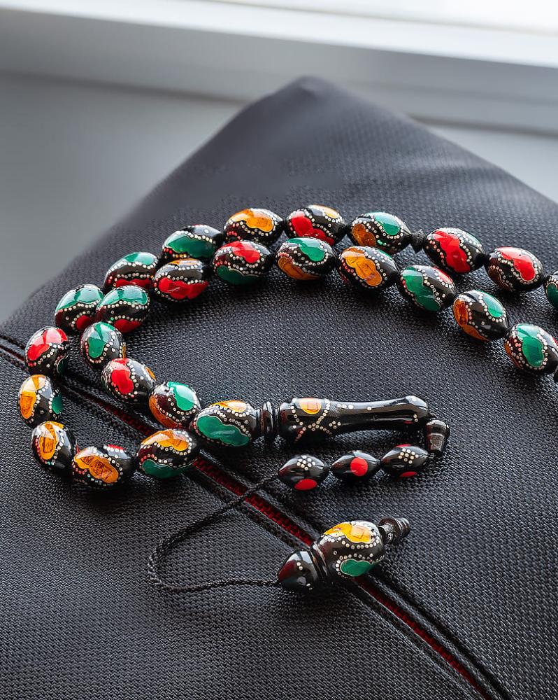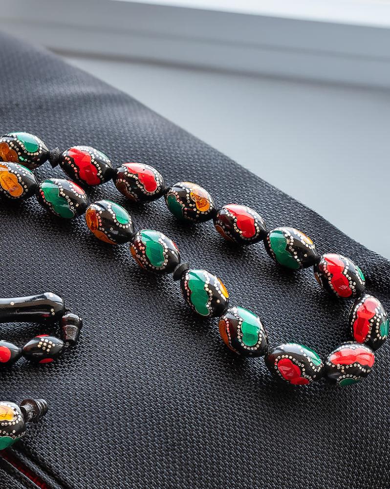سبحة من خشب الكوك الطبيعي مزخرفة بالفضة الخالصة مزينة حجر ملاكيت وشبيه الكهرمان والمرجان , بتقطيع بيضاوي متجانس ناعمة الملمس، صممت لإظهار اناقة مالكها، تتميز بحقيقة احتفاظها برائحة العطر مدة طويلة. من السبح الأكثر شهرة المميزة بخشبها الذي يستمر لوقت طويل حاملا نفس جودتها بها 33 خرزه 9 ملم وزنها 35 جرام ، جميلة وانيقة ورسمية في لونها ومظهرها لإطالة مميزة لتناسب جميع الاذواق