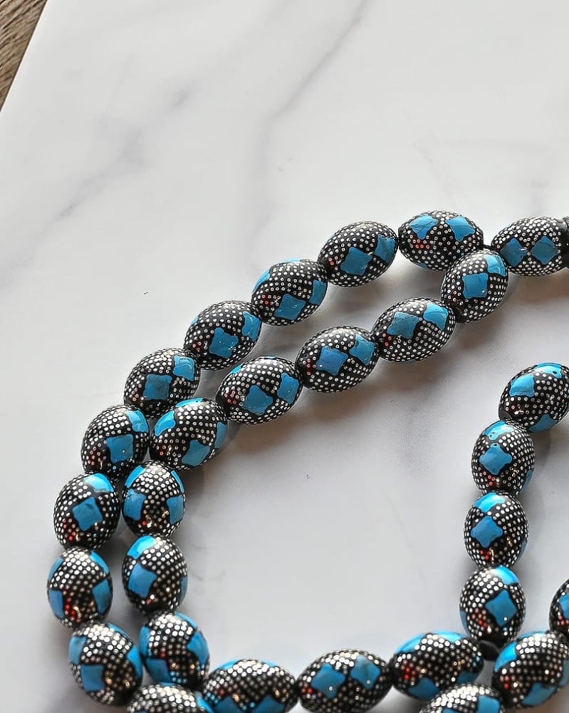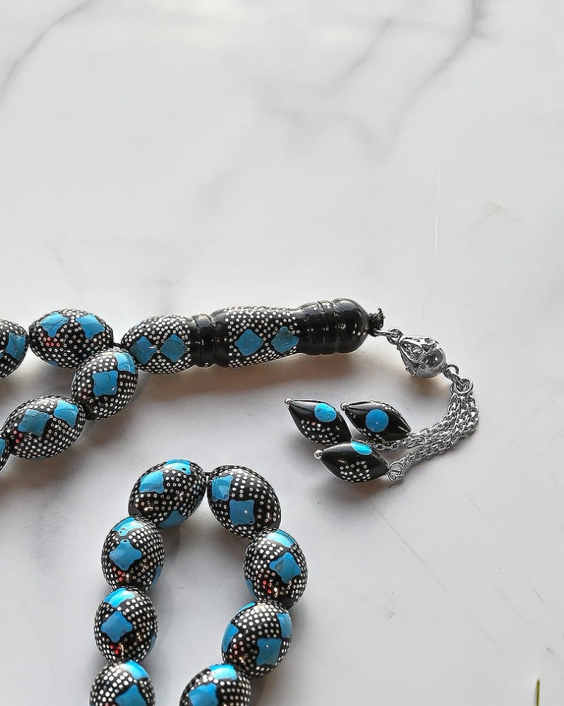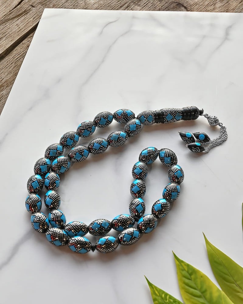 سبحة نادرة مصنوعة من خشب الكوك الطبيعي، مزخرفة بفضة خالصة وفيروز طبيعي. تتميز بتصميم بيضاوي ناعم الملمس، مع شرابة مطعمة بالفضة. تم تصميمها بواسطة أديى مهرة في حرفة صناعة السبح، وتتميز برائحة العطر التي تدوم طويلاً. تعتبر من السبح الأكثر شهرة بفضل خشبها الذي يحافظ على جودته لفترة طويلة. إنها جميلة وأنيقة ورسمية في مظهرها، مما يجعلها مثالية لجميع الأذواق.