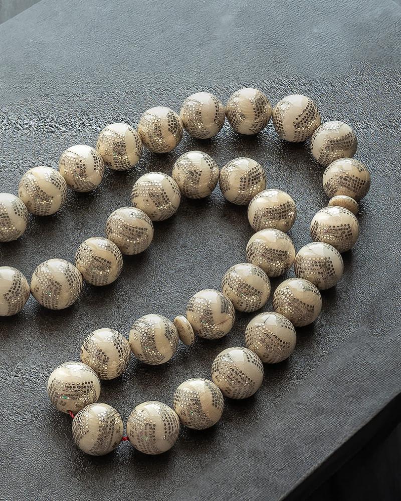 سبحة نادرة من العاج (ناب الفيل) بلون ابيض فاخرة , مزينة بكركوشة منقوشة بفضة خالصة عيار 925 ومخروطة باتقان بشكل دائري متجانس ناعمة الملمس صناعة يدوية، صممت لإظهار اناقة مالكها من السبح الأكثر شهرة المميزة بالعاج (ناب الفيل) الذي يستمر لوقت طويل حاملا نفس جودتها ، جميلة وانيقة ورسمية في لونها ومظهرها لإطالة مميزة لتناسب جميع الاذواق.