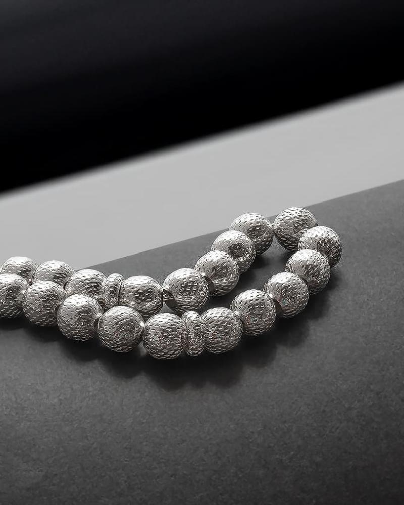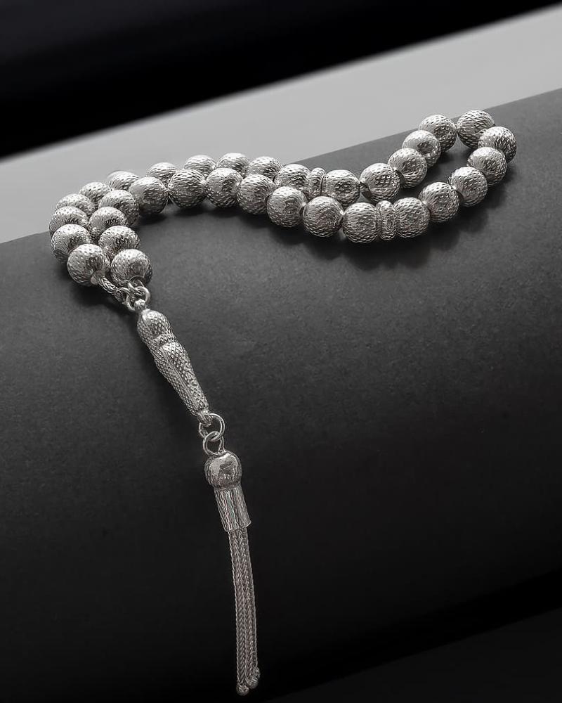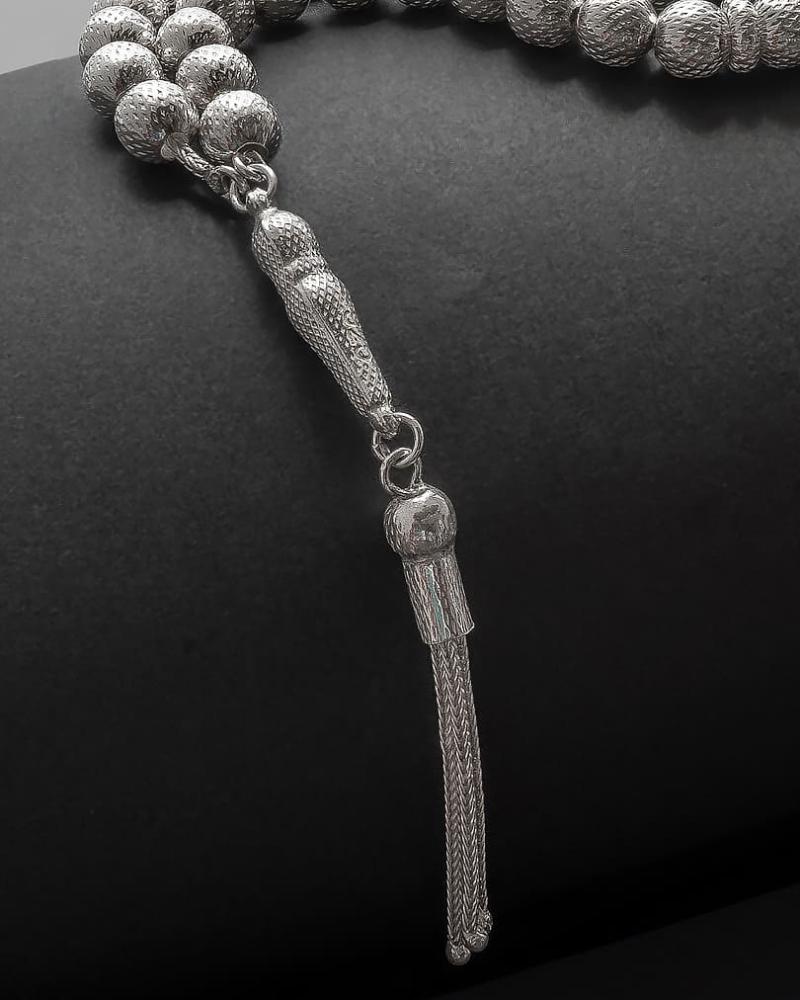 سبحة نادرة من الفضة الخالصة عيار 925 الفاخر، مزينة بكركوشة منقوشة باتقان ومصممة بشكل دائري منقوش متجانس ناعم الملمس. تمتاز هذه السبحة بأناقتها وفخامتها، صنعت بعناية يدوية لتبرز جمال مالكها. تتميز بجودتها العالية وتصميمها الراقي، مما يجعلها مثالية لتكون إكسسوارًا راقيًا وفخمًا يناسب جميع الأذواق.