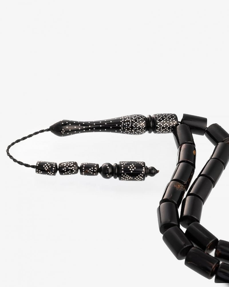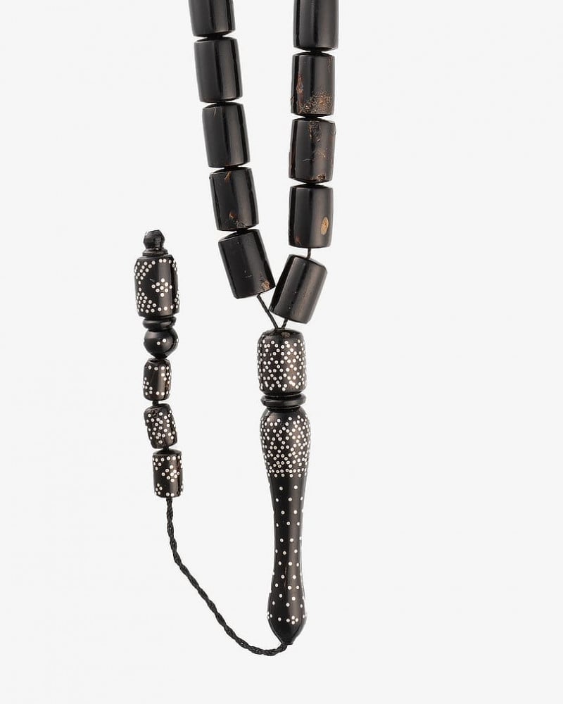 سبحة نادرة من يسر بحر الاحمر مرصعة بالفضة , بتقطيع مربع متجانس ناعمة الملمس مزينة بشرابة مطعمة بالفضة عيار 925، صممت لإظهار اناقة مالكها، تتميز بحقيقة احتفاظها برائحة العطر مدة طويلة. من السبح الأكثر شهرة المميزة بخشبها الذي يستمر لوقت طويل حاملا نفس جودتها بها 33 خرزه 10 ملم، جميلة وانيقة ورسمية في لونها ومظهرها لإطالة مميزة لتناسب جميع الاذواق.
