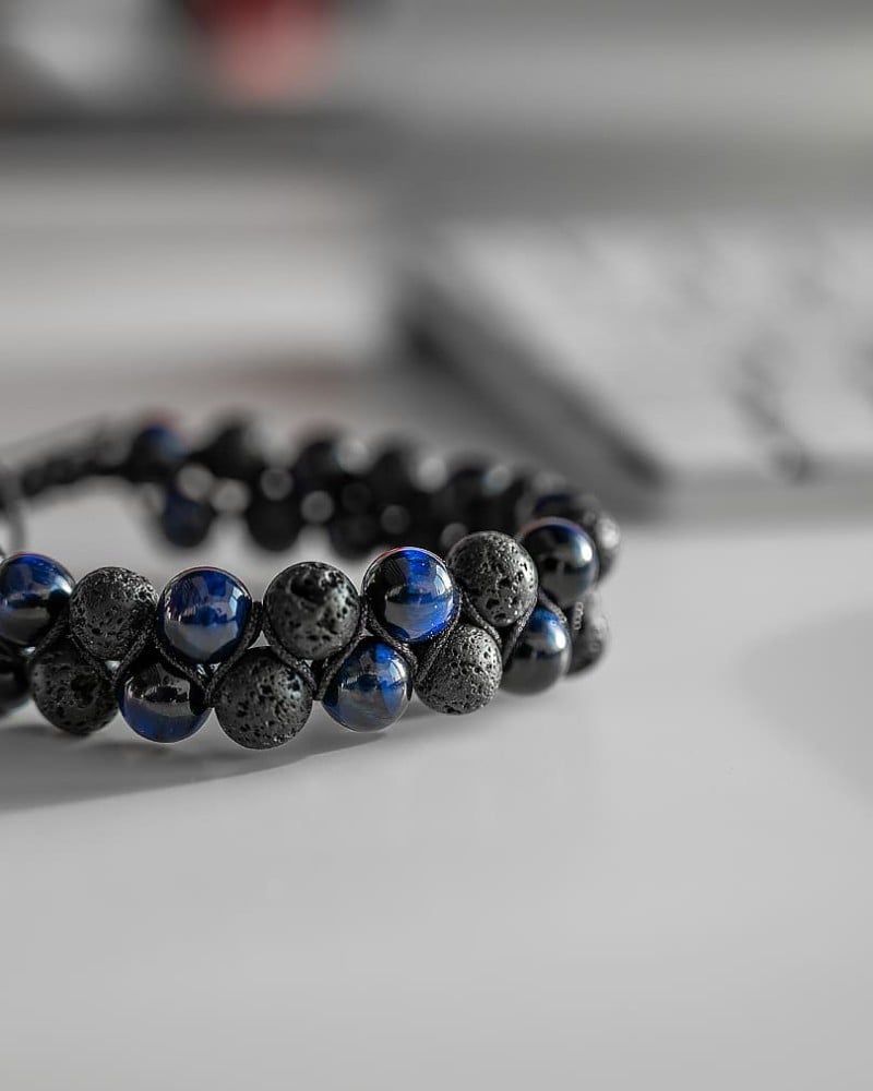 سوار حجر كريم طبيعي بلون كحلي واسود لافا , مضفر بطريقة احترافية بطبقة مزدوجة الخرز , يتميز بإغلاق على شكل خطاف يحافظ على تثبيته بإحكام حول معصمك , مُصمم ليُكمل أناقة أي زي بلمسة من الرقي.