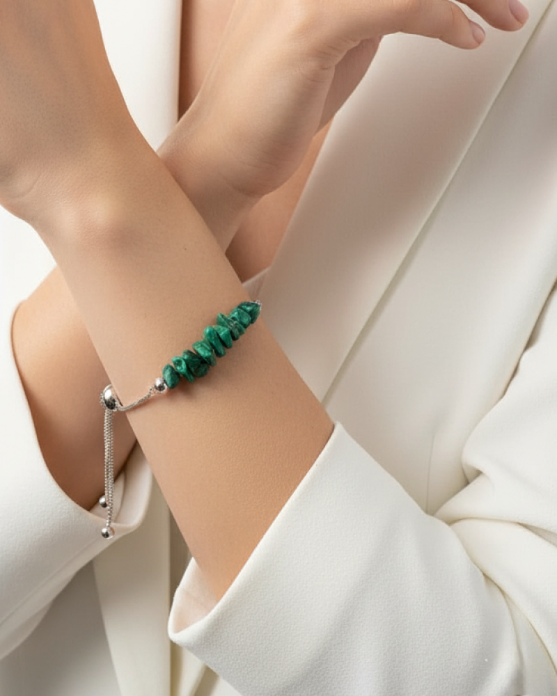 اختاري الأناقة والفخامة سوار معصم نسائي من زمروود , نحن على يقين بأن هذا السوار سيكون قطعتك المفضلة الجديدة. يحيط هذا السوار بلون فضي وحجر ملاكيت أخضر تعطي جمال واناقة الاسوارة. تميز بإغلاق على شكل خطاف يحافظ على تثبيته بإحكام حول معصمك , مناسب لجميع الاذواق والاعمار .