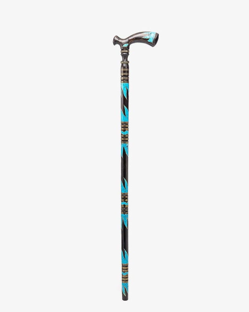 عصا عكاز من خشب ايبانوس طبيعي مزين شبيه الفيروز, منقوش بنحاس ومعدن بطريقة احترافية ناعمة الملمس ,بمقبض طولي صناعة يدوية على ايدي امهر الحرفيين المتخصين في تصنيع عصا العكاز الاخشاب الطبيعية ,وتم صقلها بإحترافية متعددة الاستخدام سميكة ,تصلح في المناسبات الاجتماعية لجميع الاذواق.