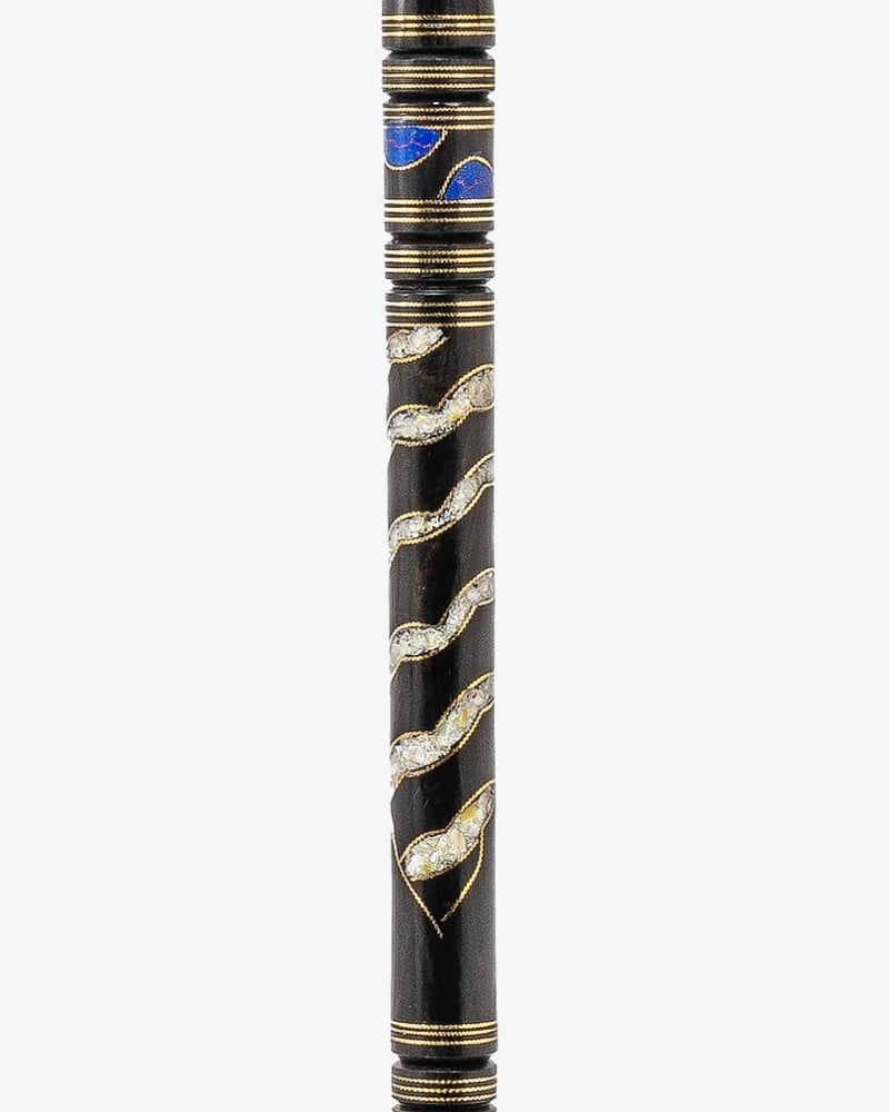 عصا عكاز من خشب ايبانوس طبيعي مزخرف صدف طبيعي وشبيه لازورد, منقوش بنحاس ومعدن بطريقة احترافية ناعمة الملمس ,بمقبض طولي صناعة يدوية على ايدي امهر الحرفيين المتخصين في تصنيع عصا العكاز الاخشاب الطبيعية ,وتم صقلها بإحترافية متعددة الاستخدام سميكة ,تصلح في المناسبات الاجتماعية لجميع الاذواق.