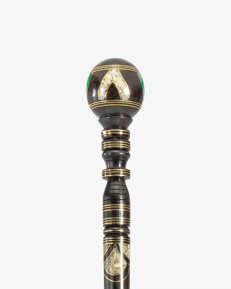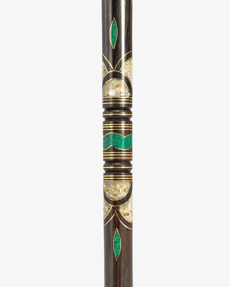 عصا عكاز من خشب ايبانوس طبيعي انيق, مزين بصدف طبيعي وملاكيت بطريقة احترافية ناعمة الملمس ,بمقبض دائري صناعة يدوية على ايدي امهر الحرفيين المتخصين في تصنيع عصا العكاز الاخشاب الطبيعية ,وتم صقلها بإحترافية متعددة الاستخدام سميكة وطولها 98 سم ,تصلح في المناسبات الاجتماعية لجميع الاذواق.