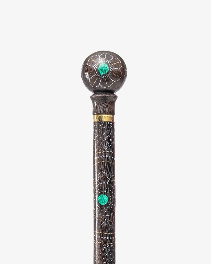 عصا عكاز من خشب فينجي طبيعي ,مطعم بحجر ملاكيت كريم وبنقش من النحاس ناعمة الملمس ,بمقبض دائري صناعة يدوية على ايدي امهر الحرفيين المتخصين في تصنيع عصا العكاز الاخشاب الطبيعية ,وتم صقلها بإحترافية متعددة الاستخدام بطول 96 سم سميك ,تصلح في المناسبات الاجتماعية لجميع الاذواق