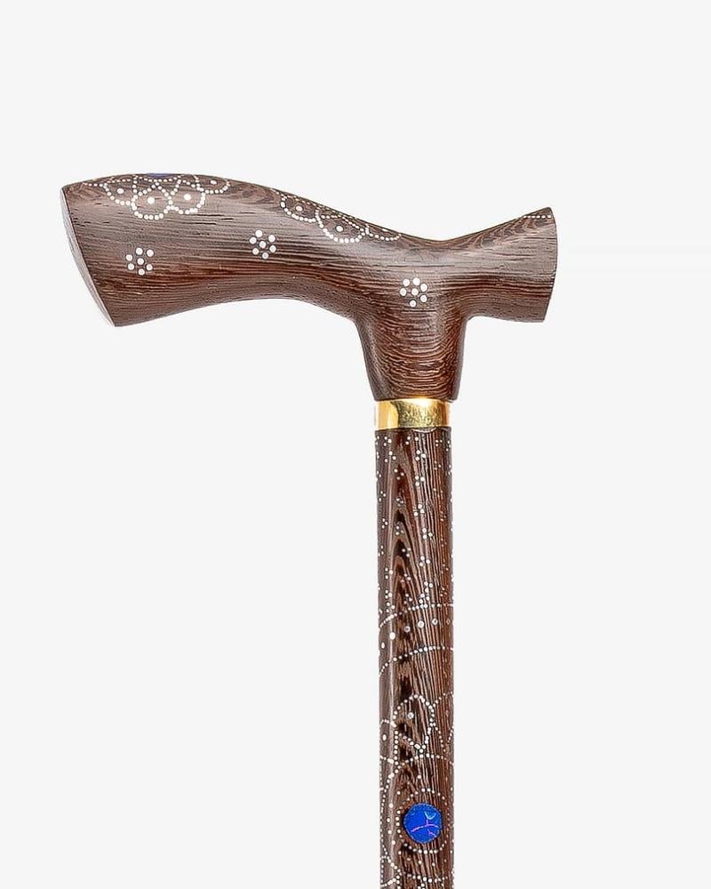 عصا عكاز من خشب فينجي طبيعي ,مزين بحجر شبيه اللازورد وبنقش من النحاس ناعمة الملمس ,بمقبض طولي صناعة يدوية على ايدي امهر الحرفيين المتخصصين في تصنيع عصا العكاز الاخشاب الطبيعية ,وتم صقلها بإحترافية متعددة الاستخدام بطول 96 سم سميك ,تصلح في المناسبات الاجتماعية لجميع الاذواق.