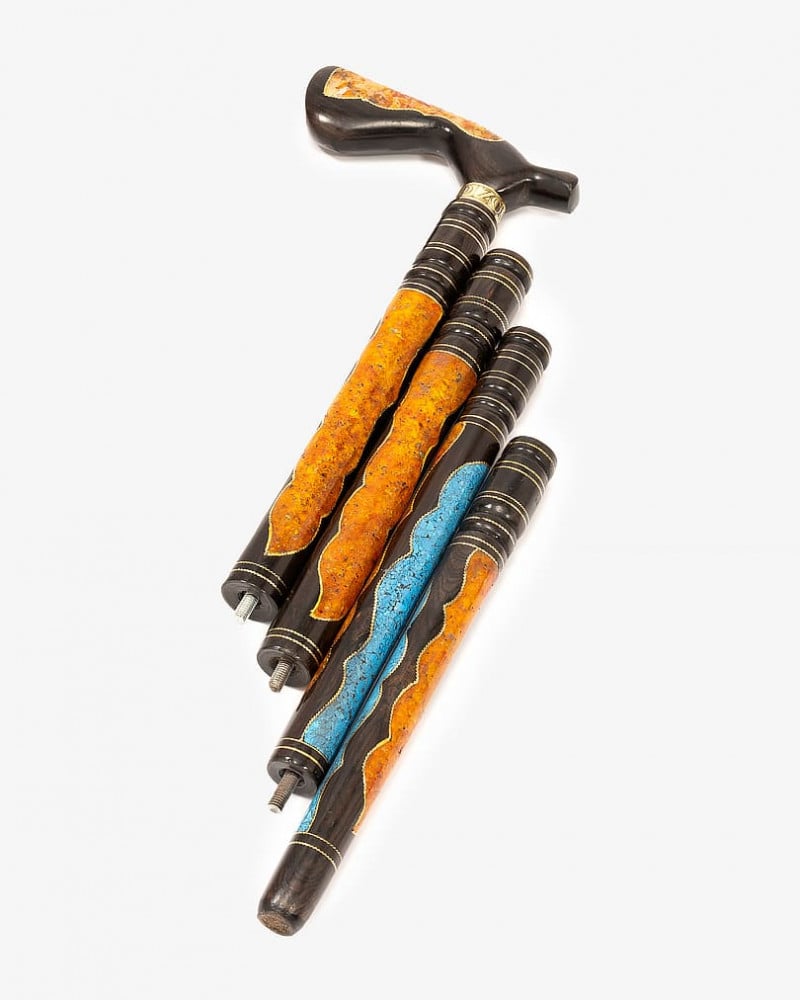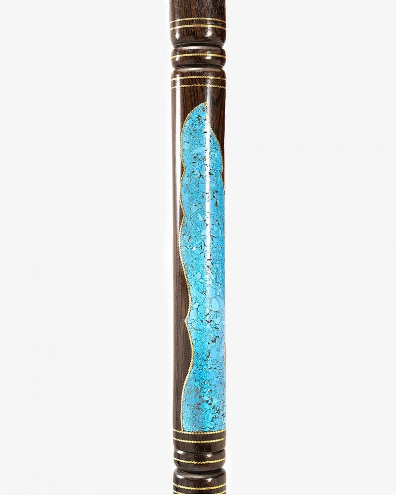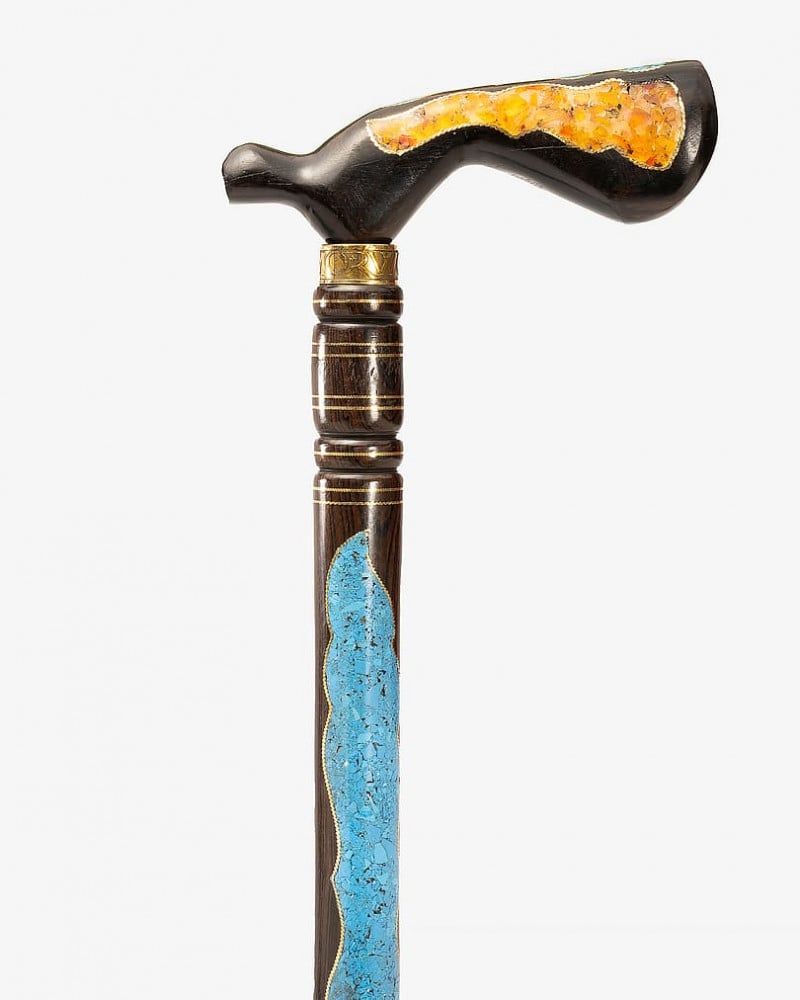 عصا عكاز من خشب الابانوس الطبيعي ,مطعم بالاحجار الشبيه للكهرمان والفيروز منقوش من النحاس ,بمقبض طولي ناعمة الملمس ,صناعة يدوية على ايدي امهر الحرفيين المختصين في تصنيع عصا العكاز الاخشاب الطبيعية ,وتم صقلها بإحترافية متعددة الاستخدام قابل للفك والتركيب بطول 95 سم خفيف الوزن ,تصلح في المناسبات الاجتماعية لجميع الاذواق