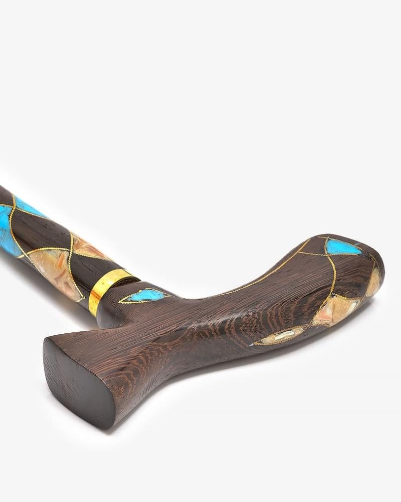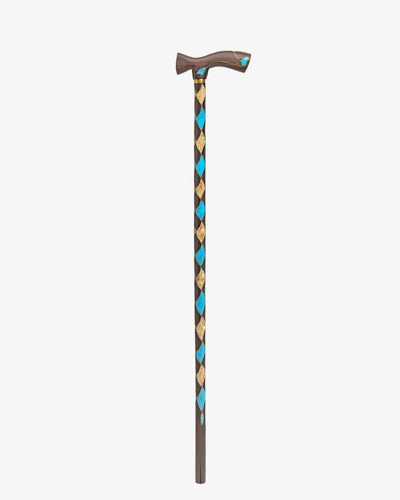 عصا عكاز من خشب فينجي طبيعي مزين شبيه الصدف وفيروز, منقوش بنحاس بطريقة احترافية ناعمة الملمس ,بمقبض طولي صناعة يدوية على ايدي امهر الحرفيين المتخصصين في تصنيع عصا العكاز الاخشاب الطبيعية ,وتم صقلها بإحترافية متعددة الاستخدام بطول 95 سم سميكة ,تصلح في المناسبات الاجتماعية لجميع الاذواق.