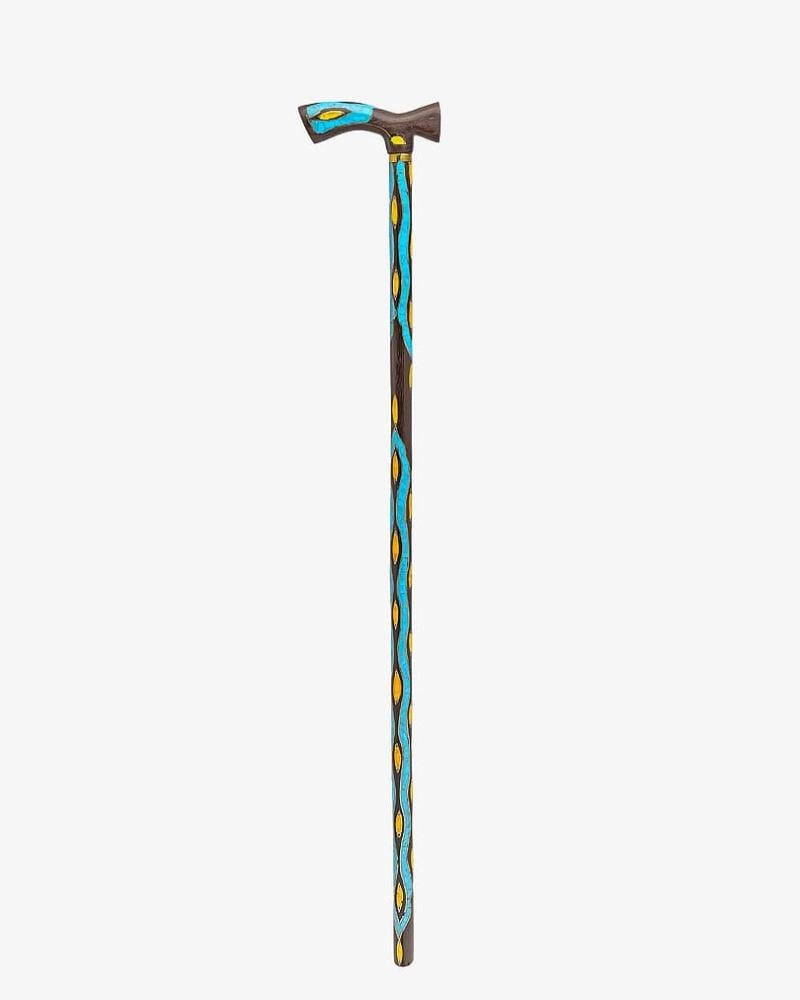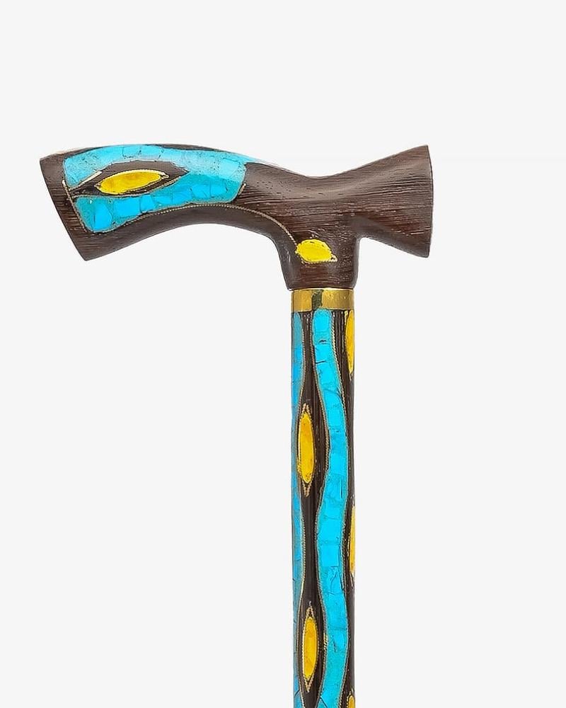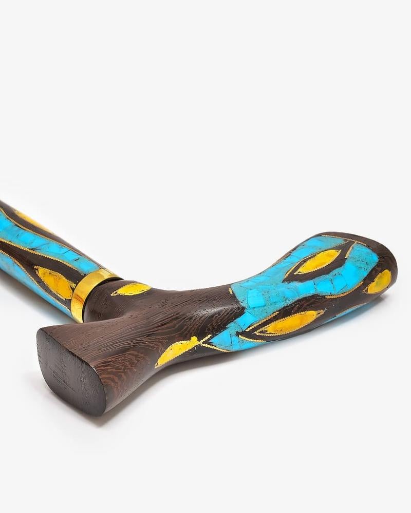 عصا عكاز من خشب فينجي طبيعي مزين شبيه الكهرمان وفيروز منقوش بنحاس بطريقة احترافية ناعمة الملمس ,بمقبض طولي صناعة يدوية على ايدي امهر الحرفيين المتخصصين في تصنيع عصا العكاز الاخشاب الطبيعية ,وتم صقلها بإحترافية متعددة الاستخدام بطول 95 سم سميكة ,تصلح في المناسبات الاجتماعية لجميع الاذواق.