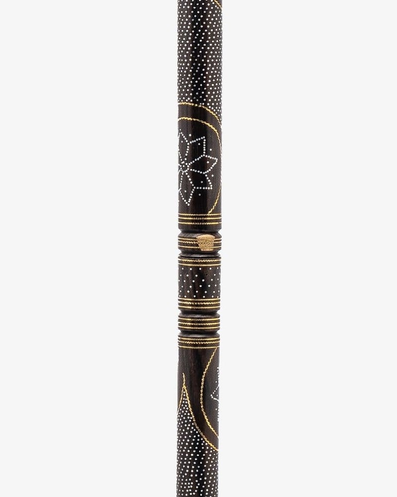 عصا عكاز فاخر من خشب ايبانوس طبيعي , منقوش بنحاس ومعدن بطريقة احترافية ناعمة الملمس ,بمقبض دائري صناعة يدوية على ايدي امهر الحرفيين المتخصين في تصنيع عصا العكاز الاخشاب الطبيعية ,وتم صقلها بإحترافية متعددة الاستخدام سميك ,تصلح في المناسبات الاجتماعية لجميع الاذواق