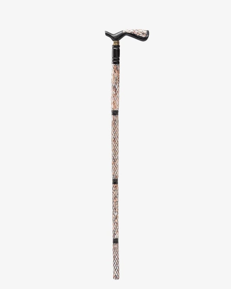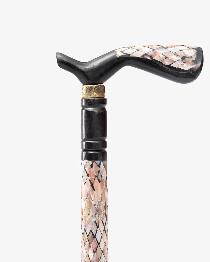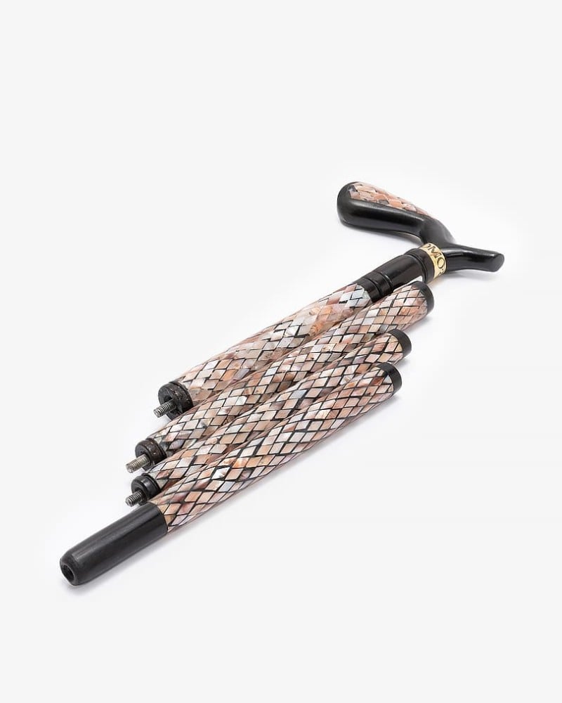 عصا عكاز انيق مصنوع من خشب الابانوس الطبيعي ,منقوش بالصدف البحري على شكل معينات ,بمقبض طولي ناعمة الملمس ,صناعة يدوية على ايدي امهر الحرفيين المختصين في تصنيع عصا العكاز الاخشاب الطبيعية ,وتم صقلها بإحترافية متعددة الاستخدام قابل للفك والتركيب بطول 89 سم سمكها عريض ,تصلح في المناسبات الاجتماعية لجميع الاذواق