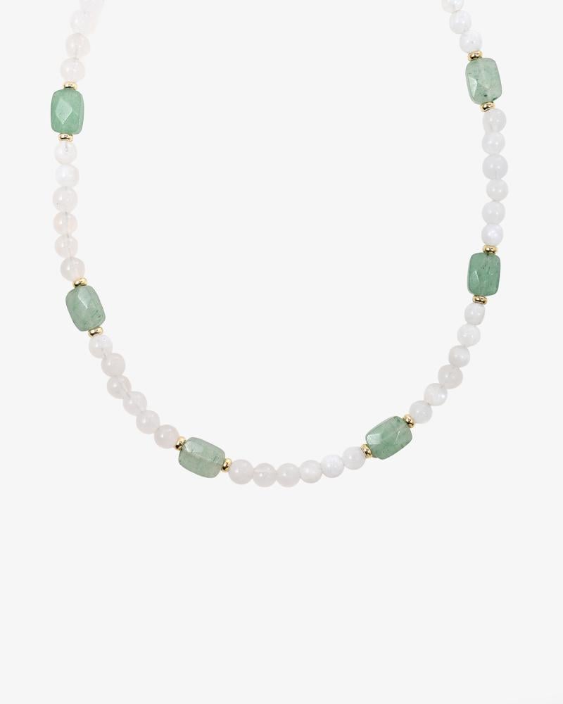 أضيفي لمسة من التوازن والفخامة لإطلالتك مع هذا العقد الساحر المصنوع من حجر الجاد الطبيعي رمز الصفاء والانسجام، والممزوج بـ حجر الأفينتورين الطبيعي المعروف بجذب الحظ والطاقة الإيجابية. التصميم يجمع بين نقاء الأبيض ولمعان الأخضر مع لمسات ذهبية أنيقة تمنح العقد حضورًا راقيًا وفريدًا.