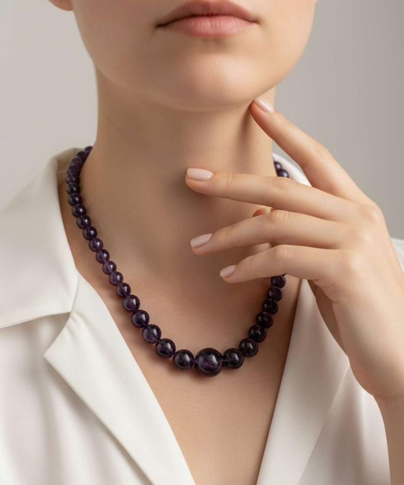 تألقي بسحر الجمشت البنفسجي العميق مع هذا العقد الفاخر 💜✨. مصنوع من أحجار طبيعية مصقولة بلمعان ساحر، حيث تتدرج الأحجار من الأصغر إلى الأكبر لتخلق تناغمًا أنيقًا وجذابًا. يُعرف الجمشت بأنه حجر الصفاء الذهني والتوازن، ويمنح مرتديه إحساسًا بالهدوء والثقة 🌿💫.
