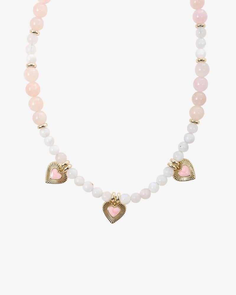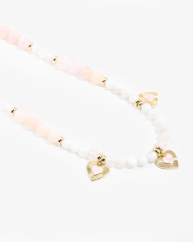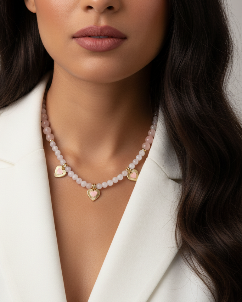 أضيفي لمسة من الرقي والأنوثة مع هذا العقد الساحر المصنوع من حجر الكوارتز الوردي الطبيعي رمز الحب والطاقة الإيجابية، والمتداخل مع حجر الجاد الطبيعي الذي يعكس الصفاء والتوازن. يزينه ثلاث تعليقات قلبية مذهلة مطلية بالذهب مع لمسة وردية ناعمة تضيف سحرًا وأناقة لكل إطلالة.