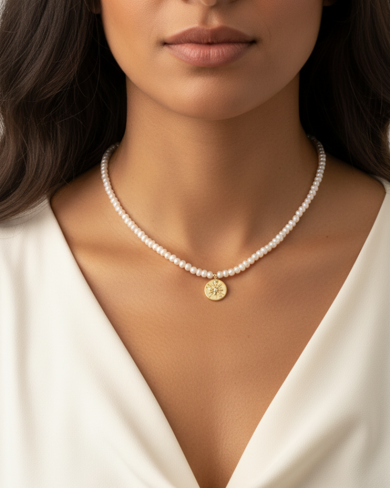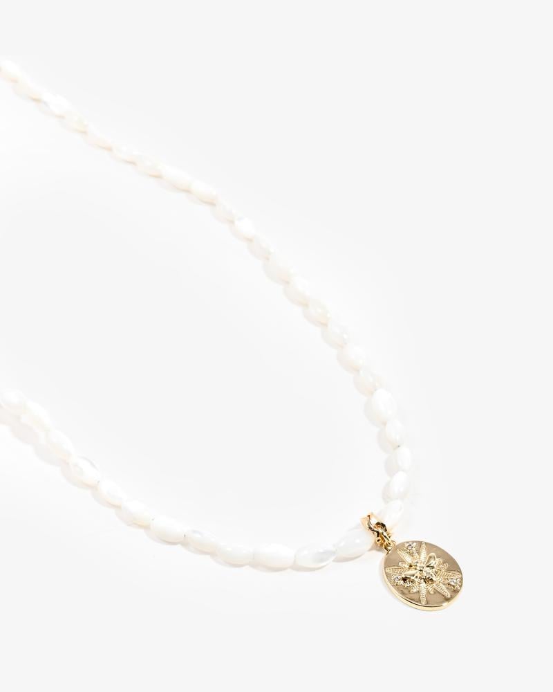 قطعة أنيقة تجمع بين جمال البحر وصفاء الطبيعة، صُنعت من حبات الصدف الطبيعي بلونها الأبيض الناعم مع تعليقة ذهبية تضيف لمسة فخامة ورقي. تصميم يجمع بين البساطة والتميز ليكون إضافة مثالية لإطلالتك اليومية أو لمناسباتك الخاصة.