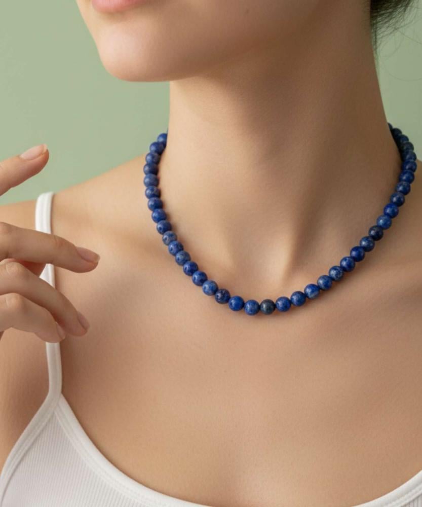 عقد نسائي أنيق مصنوع من حجر اللازورد الطبيعي بتصميم كرات مستديرة مصقولة بعناية. يتميز بألوانه المتدرجة بين الأزرق الملكي والنقوش الرمادية التي تعكس فخامة الأحجار الطبيعية. مزود بقفل معدني فضي لسهولة الارتداء والإغلاق، مما يجعله قطعة مثالية لإضفاء لمسة أنيقة على الإطلالات اليومية والمناسبات الخاصة.