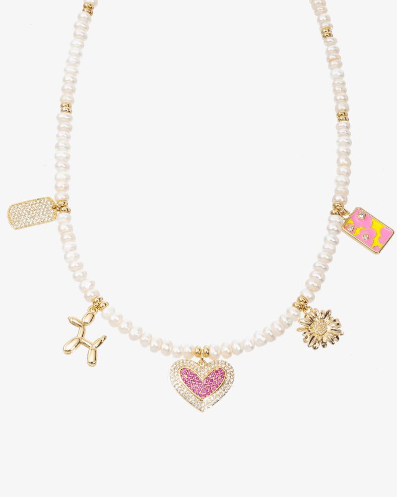 استمتعي بإطلالة أنيقة وجذابة مع هذه القلادة الفريدة المصنوعة من حبات اللؤلؤ الفاخر مع لمسات من الذهب اللامع! 💖 تتزين القلادة بمجموعة من التعليقات العصرية، بما في ذلك: