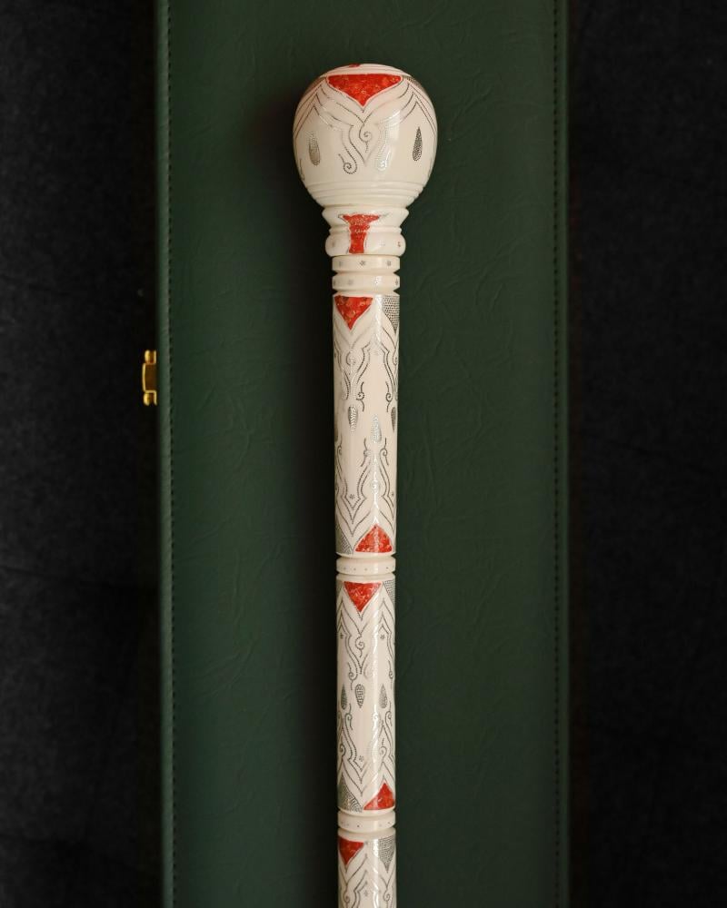 عكاز العاج المصنوع من ناب الفيل منقوش بالفضة الخالصة عيار 925 و المرجان الطبيعي الاحمر ، ,هو قطعة فاخرة وذات قيمة عالية، وغالبًا ما تعتبر تحفة فنية.