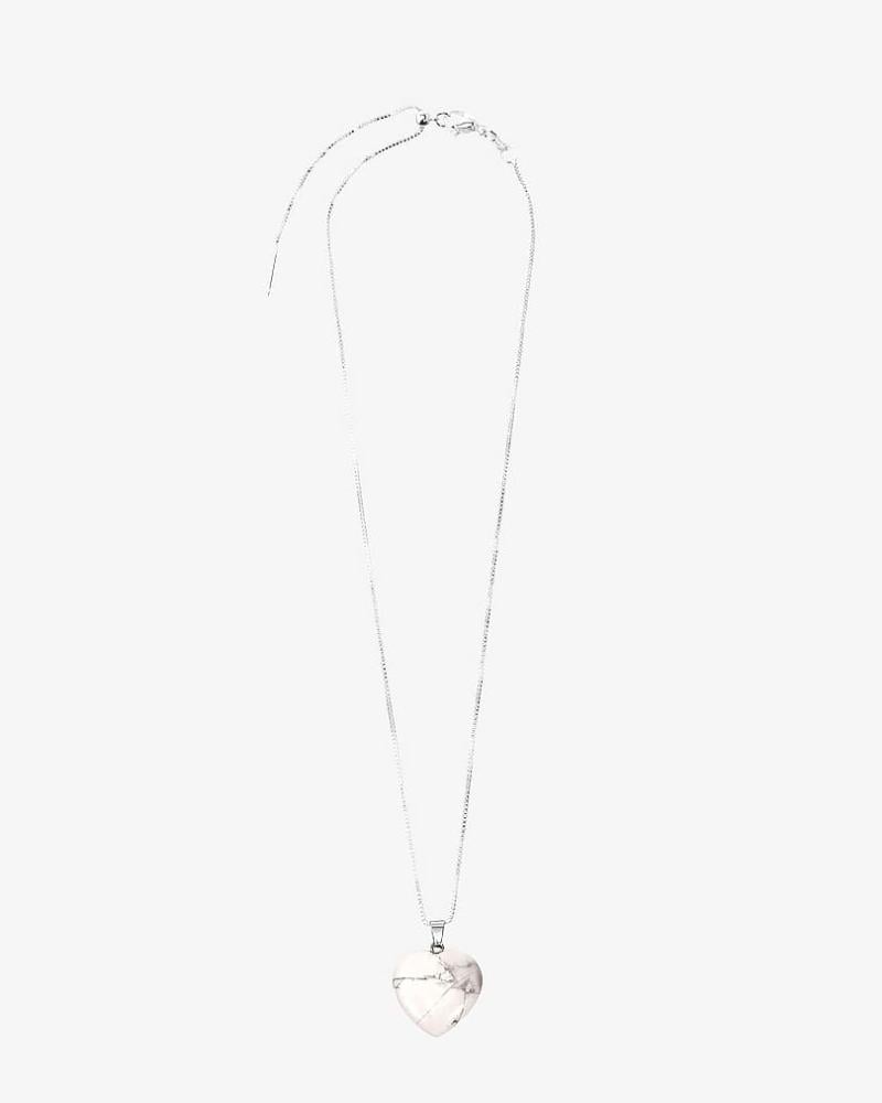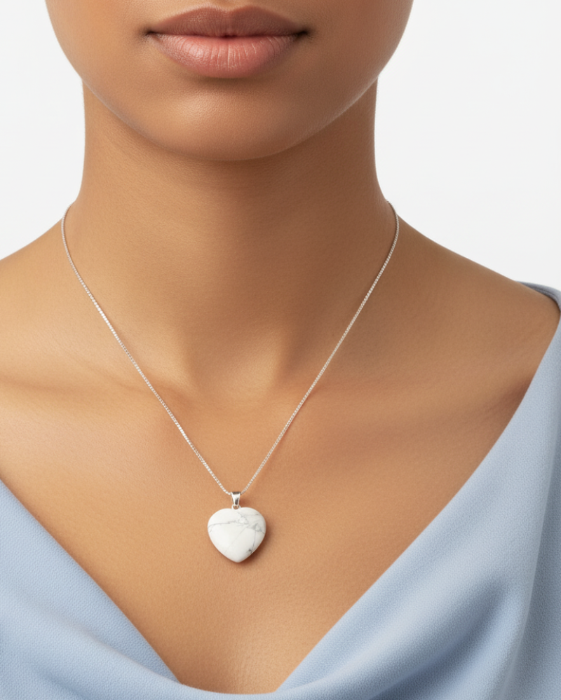 ✨ عقد أنيق بسلسلة فضية وقلادة قلب من حجر الهوليت الأبيض 🤍✨ أضف لمسة من الصفاء والأناقة إلى إطلالتك مع هذا العقد الرائع! 🤍 يتميز بتصميم راقٍ يجمع بين سلسلة فضية رقيقة وقلادة بشكل قلب مصنوعة من حجر الهولايت الأبيض، المعروف بخصائصه في تعزيز الهدوء والتوازن النفسي.