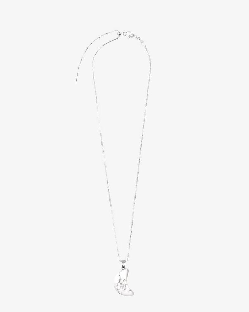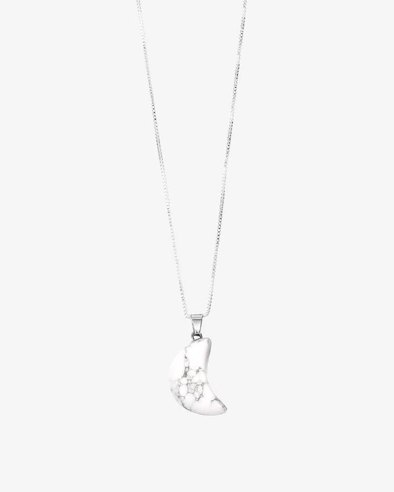 ✨ عقد أنيق بسلسلة فضية وقلادة القمر من حجر الهوليت الأبيض 🤍✨ أضف لمسة من الصفاء والأناقة إلى إطلالتك مع هذا العقد الرائع! 🤍 يتميز بتصميم راقٍ يجمع بين سلسلة فضية رقيقة وقلادة بشكل قمر مصنوعة من حجر الهولايت الأبيض، المعروف بخصائصه في تعزيز الهدوء والتوازن النفسي.
