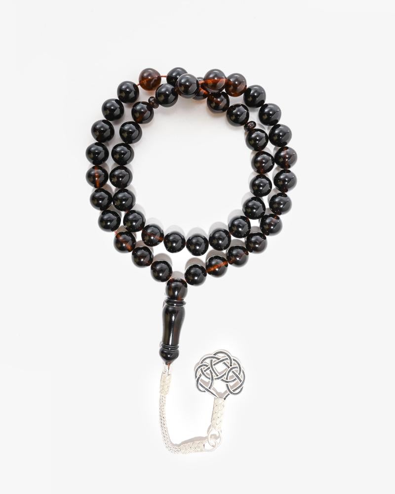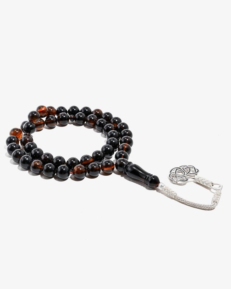 سبحة فاتوران صب حديد ناعمة الملمس بلون بني غامق شفاف ، مخروطة بإتقان على شكل دائري تمتاز بتنوع في الشكل واللون والمظهر وكركوشة فضة عيار 1000، صممت لإظهار اناقة مالكها وقوة حضوره واناقته وذوقه الرفيع، من أكثر انواع الفاتوران جمالا وأناقة ورسمية في لونه ومظهره لتناسب جميع الاذواق.
