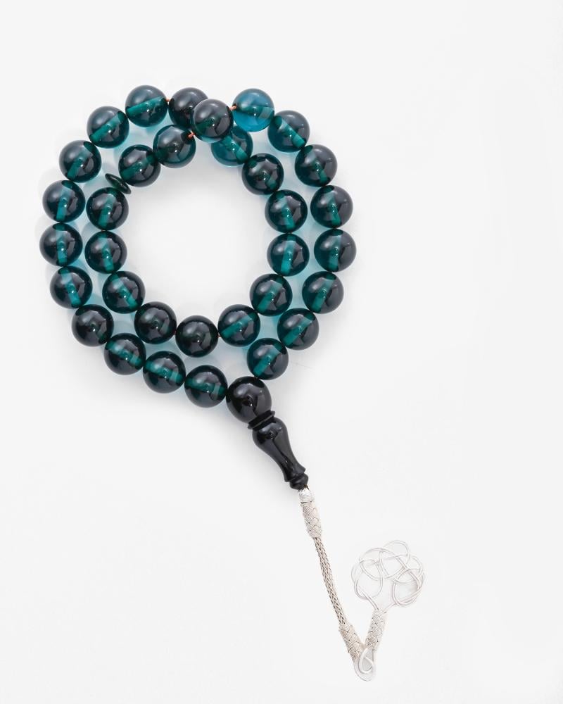 سبحة فاتوران صب حديد ناعمة الملمس بلون تركوازي شفاف ، مخروطة بإتقان على شكل دائري تمتاز بتنوع في الشكل واللون والمظهر وكركوشة فضة عيار 1000، صممت لإظهار اناقة مالكها وقوة حضوره واناقته وذوقه الرفيع، من أكثر انواع الفاتوران جمالا وأناقة ورسمية في لونه ومظهره لتناسب جميع الاذواق.
