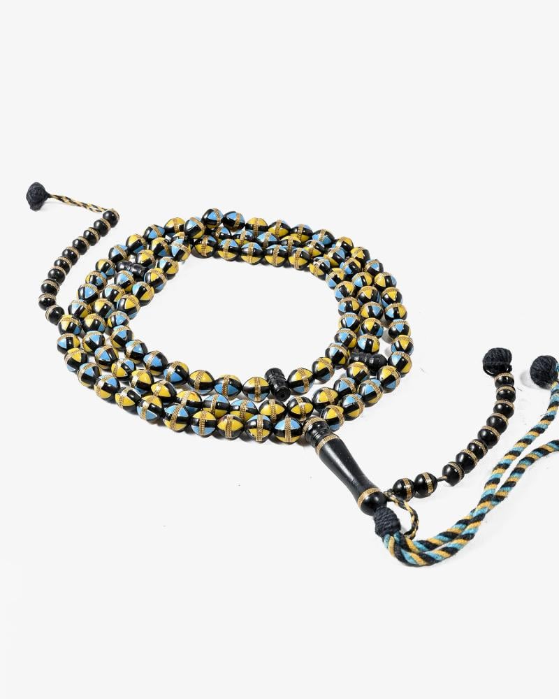 سبحة من الكوك الطبيعي مزخرفة شبيه الكهرمان والفيروز . بتقطيع بيصاوي ذروي متجانس ناعمة الملمس، صممت لإظهار اناقة مالكها، تتميز بحقيقة احتفاظها برائحة العطر مدة طويلة. من السبح الأكثر شهرة المميزة بخشبها الذي يستمر لوقت طويل حاملا نفس جودتها بها ، جميلة وانيقة ورسمية في لونها ومظهرها لإطالة مميزة لتناسب جميع الاذواق.