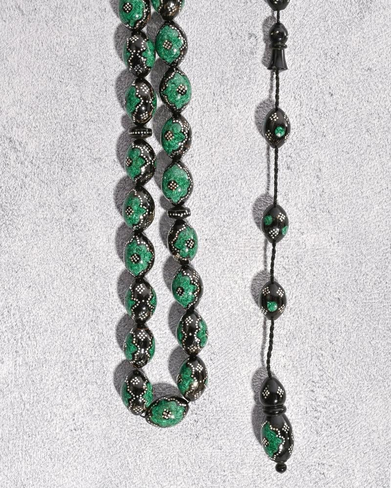 سبحة فاخرة مصنوعة من خشب اليسر الطبيعي المزخرف بالفضة الخالصة والملاكيت الأخضر، بتصميم متناغم وناعم الملمس يجعلها تبرز بأناقة لا مثيل لها. تتميز هذه السبحة بشرابة مزينة بالفضة، مما يضفي لمسة فخامة على مظهرها. تصميمها الراقي والجميل يجعلها مثالية لتكون إكسسوارًا أنيقًا ورسميًا يلفت الأنظار. باللون الفخم والمظهر الفاخر، فهى تضيف لمسة من الأناقة والجمال إلى إطلالتك.