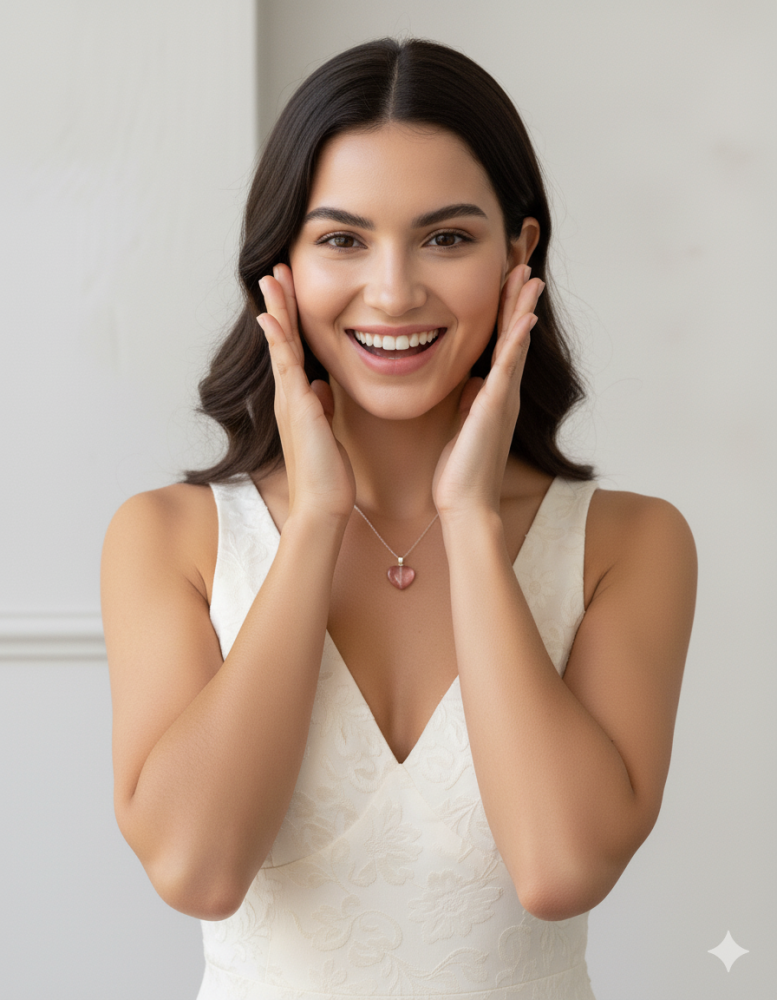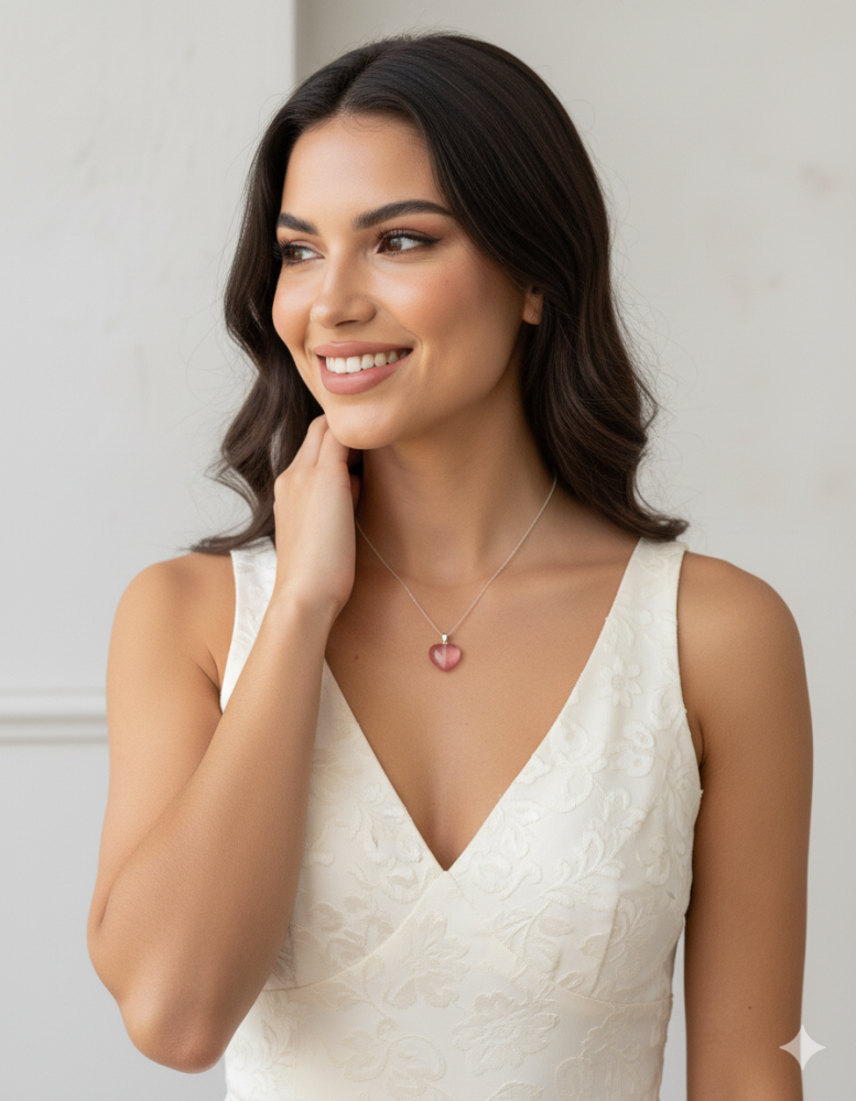 ✨ عقد رومانسي بسلسلة فضية وقلادة قلبية من حجر الكوارتز الوردي 💖💎 اجعلي إطلالتك أكثر أنوثة ورقة مع هذا العقد الساحر! 💕 يتميز بسلسلة فضية أنيقة تحمل قلادة على شكل قلب مصنوعة من حجر الكوارتز الوردي الطبيعي، المعروف بأنه حجر الحب والسلام الداخلي.