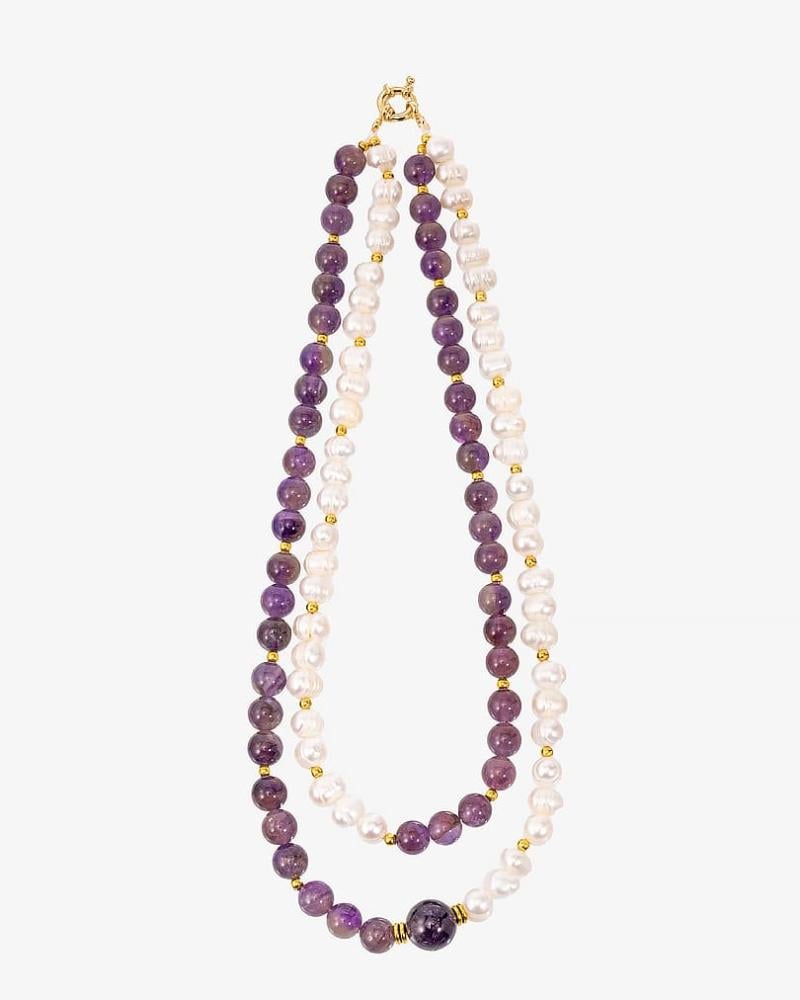 اجمعي بين الفخامة والرقي مع هذا العقد الفريد المصنوع من اللؤلؤ الطبيعي الناصع البياض وأحجار الجمشت البنفسجية العميقة المطليه بالذهب عيار 14💜🤍. تصميمه الراقي مزين بلمسات ذهبية فاخرة تضيف لمسة من الأناقة الكلاسيكية والعصرية في آنٍ واحد.