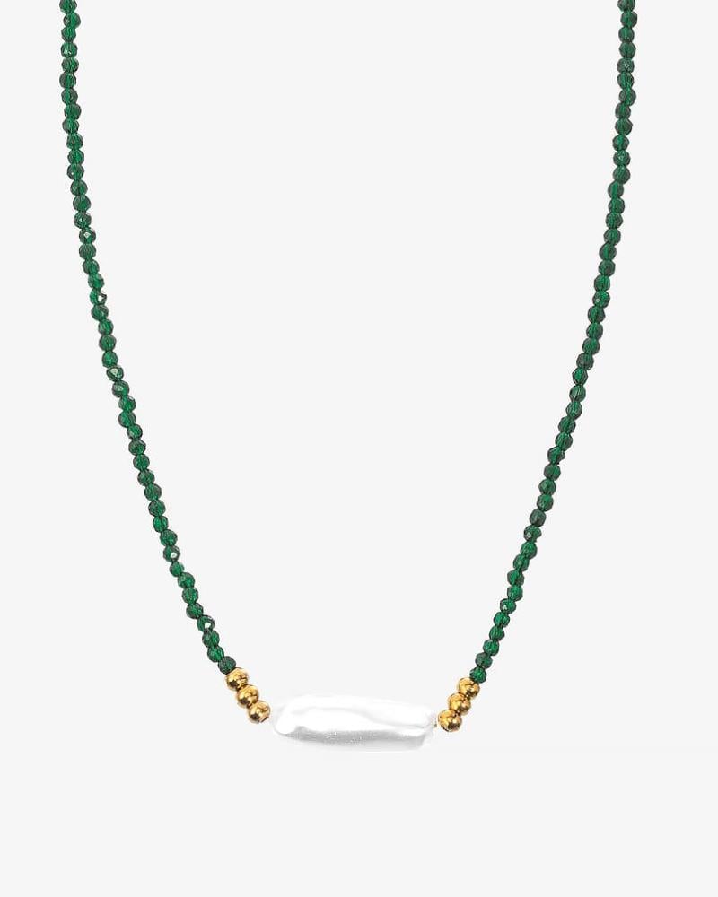 ✨ قلادة أنيقة بحبات الزمرد 💚💫 قلادة أنيقة مصنوعة من حبات كريستالية بلون الزمرد الأخضر 🌿 مع لمسات من خرز ذهبي صغير بمقاس 2-3 ملم 🔆، تتوسطها صدفه طبيعية بشكل غير منتظم 🪷، تمنحك إطلالة عصرية وناعمة.