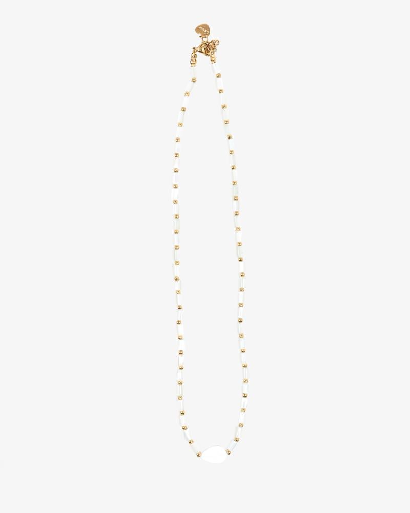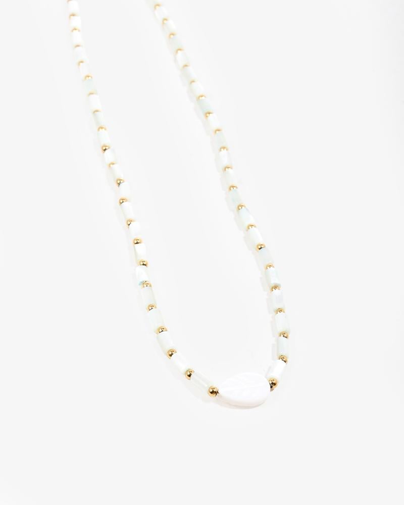 ✨ أضيفي لمسة من الأناقة الراقية إلى إطلالتك مع هذا العقد المميز المصنوع من حبات الصدف بلون سماوي الطبيعي والمزين بفواصل ذهبية براقة. تصميم عصري يجمع بين البساطة والفخامة,