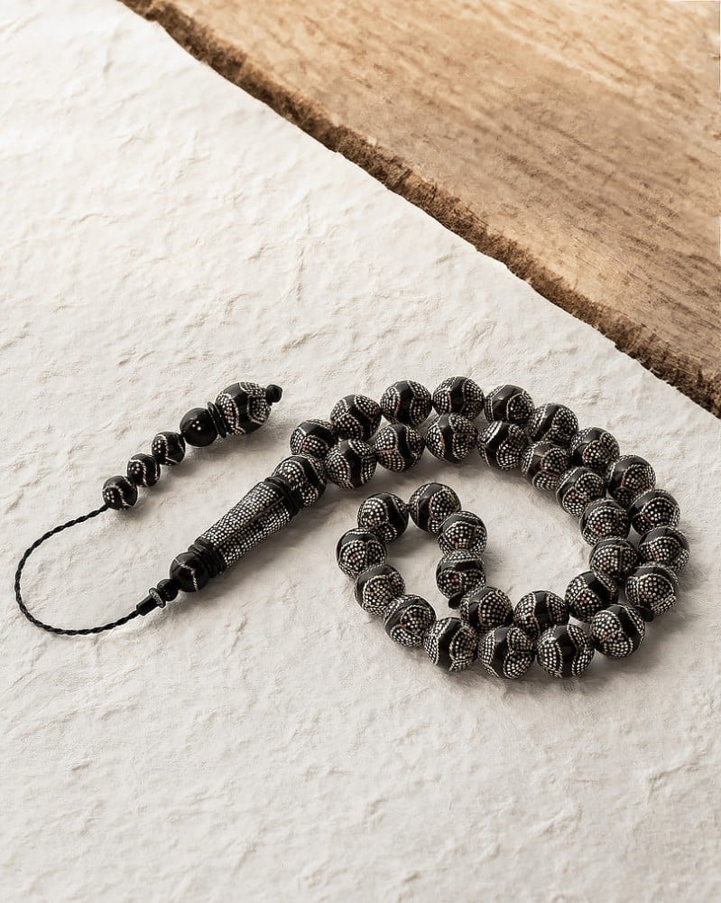This rare natural cocoa wood rosary is attractively carved, with a uniform circular cut and a wonderfully smooth texture. It is decorated with a silver inlaid tassel, which gives it a touch of luxury and elegance.