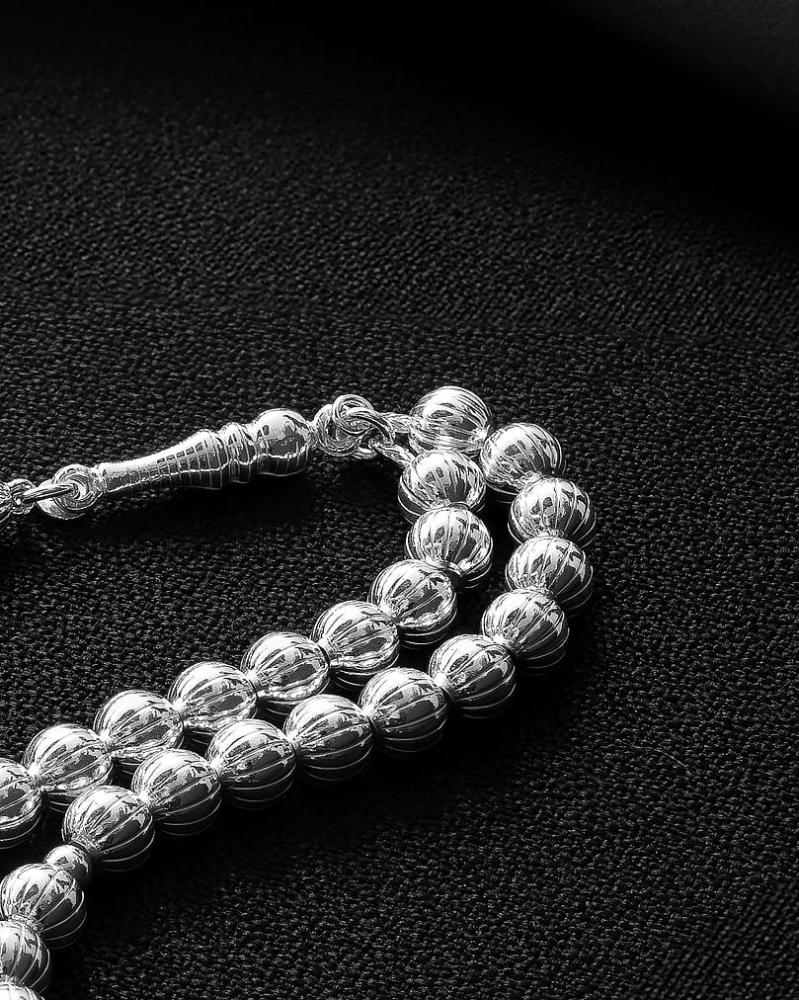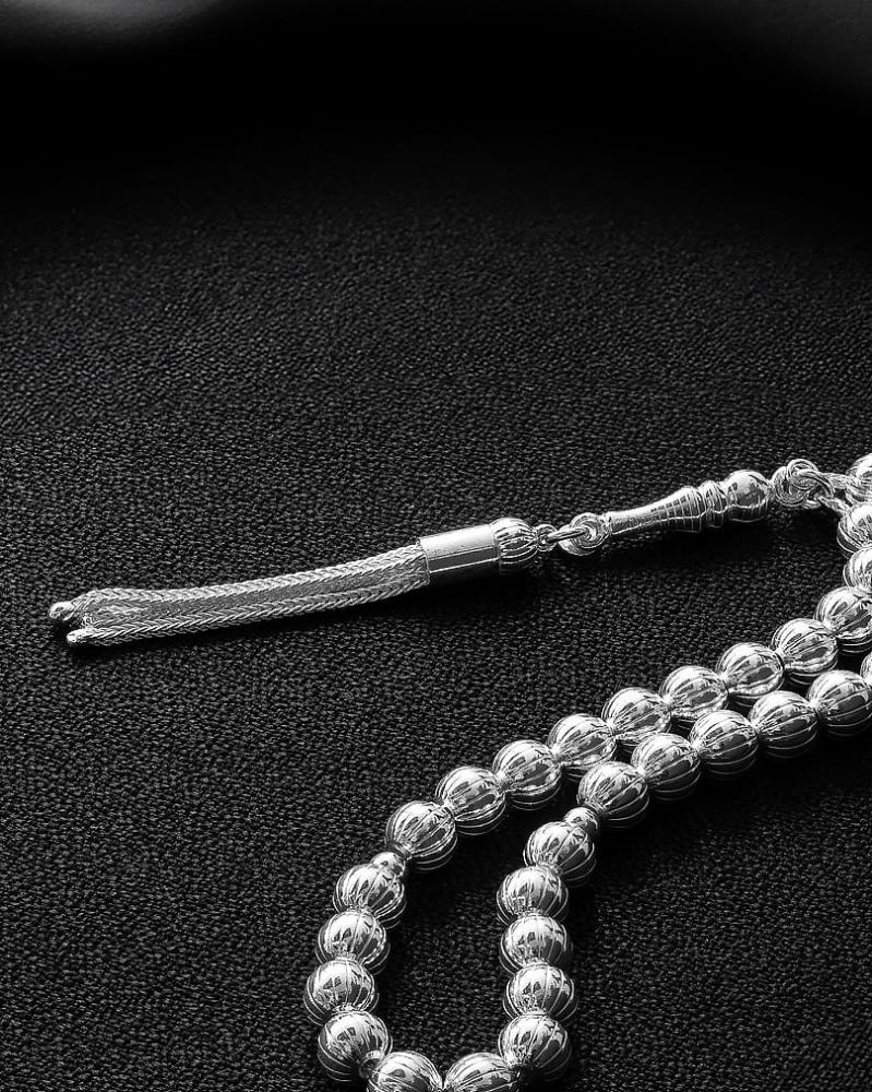 A rare rosary made of pure silver, 925 carats, decorated with a meticulously engraved tassel and designed in a smooth, smooth, circular striped shape. This rosary is distinguished by its elegance and luxury, carefully handcrafted to highlight the beauty of its owner. It is characterized by its high quality and sophisticated design, making it ideal as a sophisticated and luxurious accessory that suits all tastes.