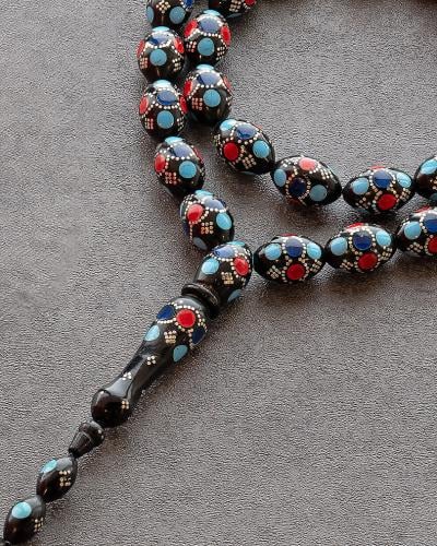 A rosary made of natural wood engraved with mirrors and turquoise-like, with a smooth, homogeneous oval cut, engraved with metal, designed to show the elegance of its owner, characterized by the fact that it retains the scent of perfume for a long time. One of the most famous rosaries distinguished by its wood that lasts a long time, carrying the same quality. It has 33 beads, 9 mm, weighing 37 grams. Beautiful, elegant and formal in its color and appearance for a distinctive extension to suit all tastes.