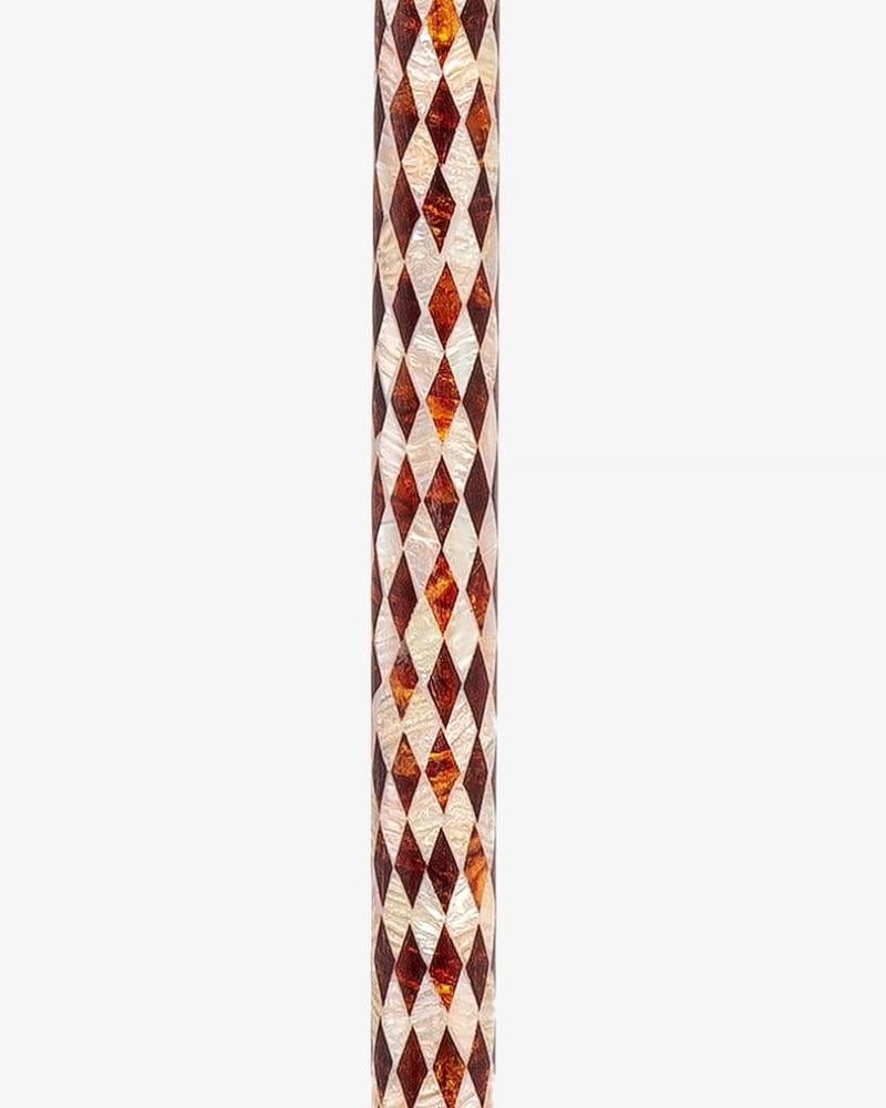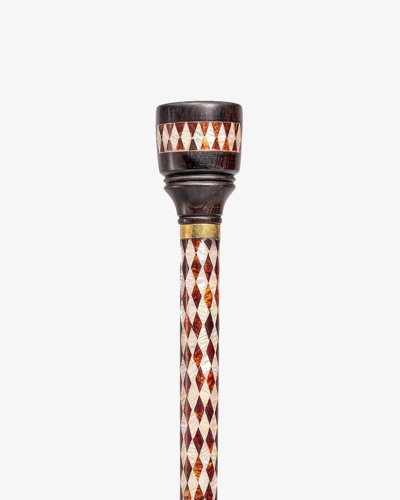 A crutch made of luxurious Ebanus wood, professionally inlaid with soft-touch artificial mother-of-pearl, with a round handle, handmade by the most skilled craftsmen specialized in manufacturing crutches from natural wood. It has been professionally polished, multi-use, light in weight, 94 cm long, suitable for social occasions for all tastes.