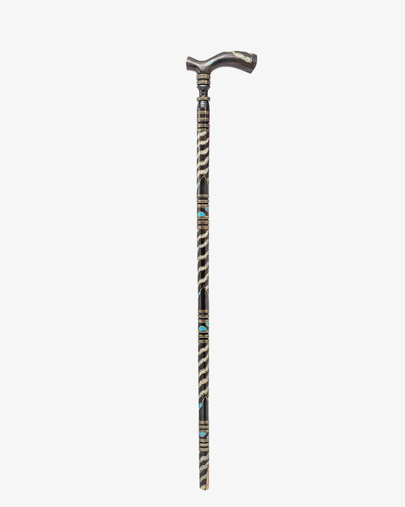A crutch made of natural Ebanus wood, decorated with natural mother-of-pearl and turquoise-like, professionally engraved with copper and metal, soft to the touch, with a longitudinal handle, handmade by the most skilled craftsmen specialized in manufacturing crutches made of natural wood, and professionally polished, multi-use, thick, suitable for social occasions for all tastes.